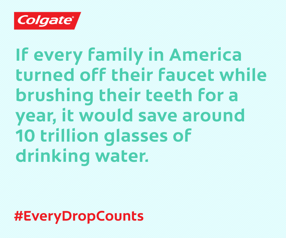 Desde el 2013, Colgate ha promovido crear consciencia sobre el cuidado del agua a casi un billón de personas, a través de recordatorios en los empaques, tiendas al por mayor y el programa “Bright Smiles, Bright Futures”. Con una presencia en más de 200 países y territorios, la mayoría de los cuales son parte del mundo emergente, Colgate está comprometido a impulsar una reducción global del desperdicio de agua en todas las regiones. En un mundo donde el agua se está volviendo escasa, Colgate sabe que es importante empezar por algún lado, y crear conciencia en algo tan simple como cerrar la llave del agua mientras te cepillas los dientes puede hacer una gran diferencia.