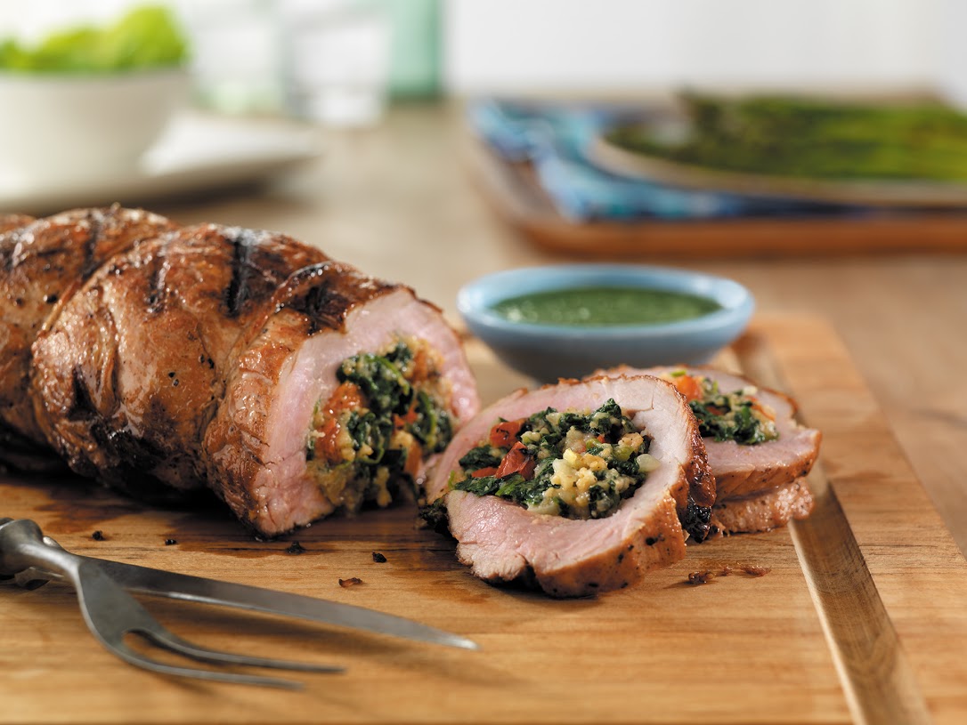 - Lomo de Cerdo Argentino con Chimichurri – Ya es hora de que tu parrilla le de la mano a esta agradable y preferida receta de Argentina para una reunión en tu patio, donde todos quedarán con la boca abierta. Se rellena el lomo de cerdo con ajo salteado, espinacas, ajíes, queso y pan rallado, luego se cocina a la parrilla y se sirve con una salsa de chimichurri agria y picante.