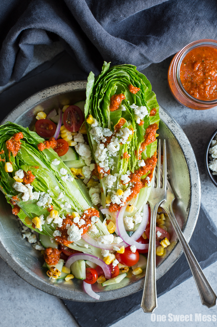 - En un tazón grande, combine la lechuga, el maíz, los tomaticos, el pepino y el queso azul. Revuelva para combinarlo todo bien. Sirva aderezado con la vinagreta de pimientos rojos asados.