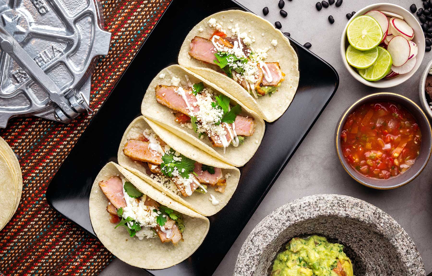 Información clave sobre Tacos: Una "taquiza" es una reunión informal donde la gente se reúne alrededor de la parrilla o la mesa con tortillas en mano, listos para crear sus propios tacos. Para celebrar tu propia “taquiza”, prepara un adobo mexicano con chipotle, chile en polvo, comino, orégano y ajo. Luego, asa el lomo, córtalo en cubos de 1/2 pulgada y –aquí viene la mejor parte– escoge los rellenos y las salsas. Coge una tortilla de maíz y rellena con pico de gallo, guacamole, crema agria, frijoles y queso cotija. ¿Listo para atacar? Haz la fila (del taco).