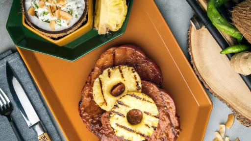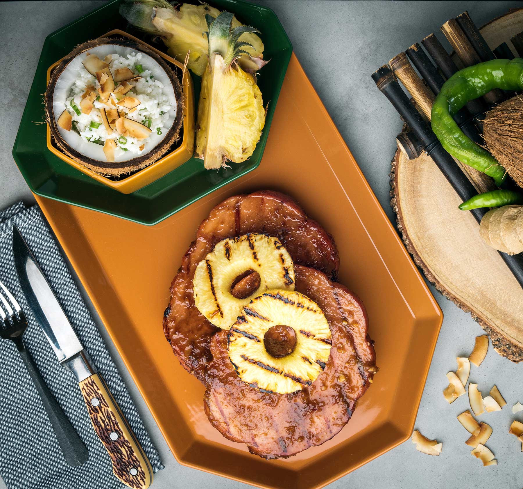 Le damos un toque especial al jamón tradicional con piña usando un glaseado de teriyaki –la combinación perfecta entre dulce y picante– hecho con jugo de piña, soja y azúcar. Sólo añade salsa de ajo con chiles, jalapeños o sriracha para despertar tu paladar.