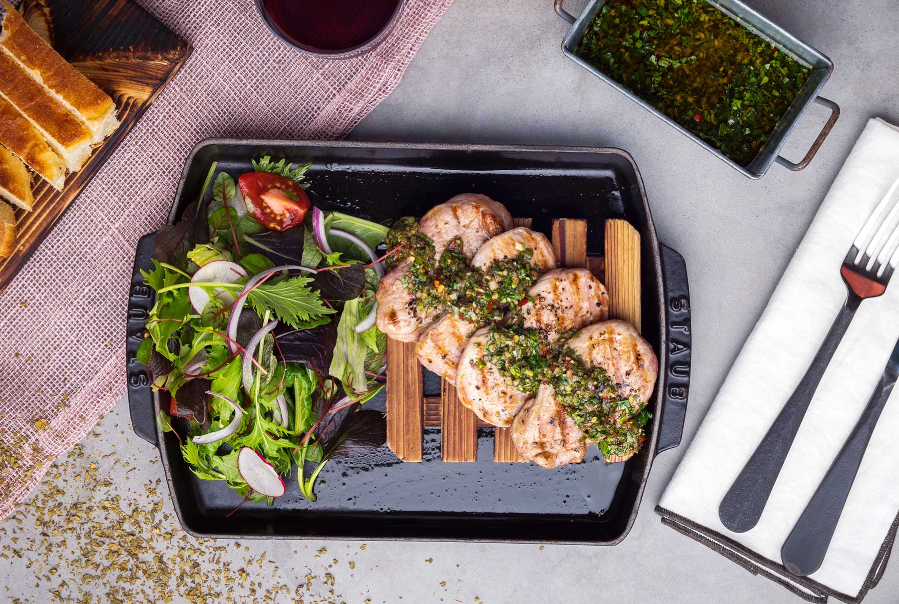 Uno de los regalos más grande que Argentina le dio al mundo es sin duda su chimichurri. Esta deliciosa salsa llena de sabor se prepara con perejil, ajo, orégano y otras hierbas. Sugerencia del chef: Agrégale anchoas picadas, cáscara de limón y vinagre para resaltar el sabor. Marina el cerdo extra magro en esta salsa argentina para lograr un plato que seguramente será un deleite de multitudes.