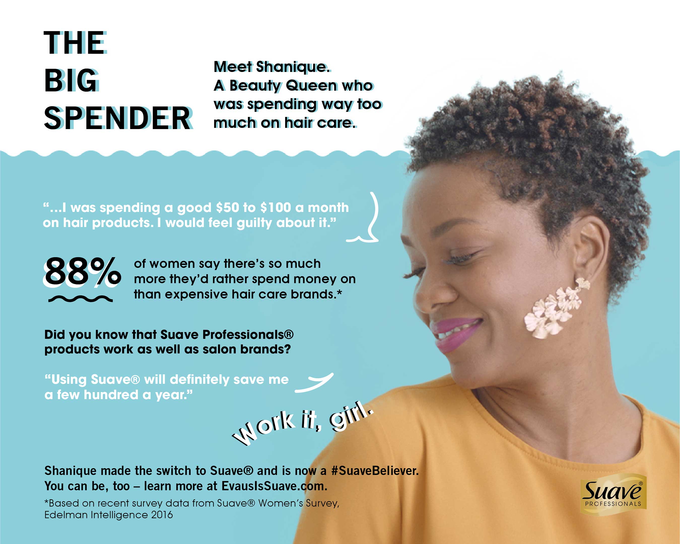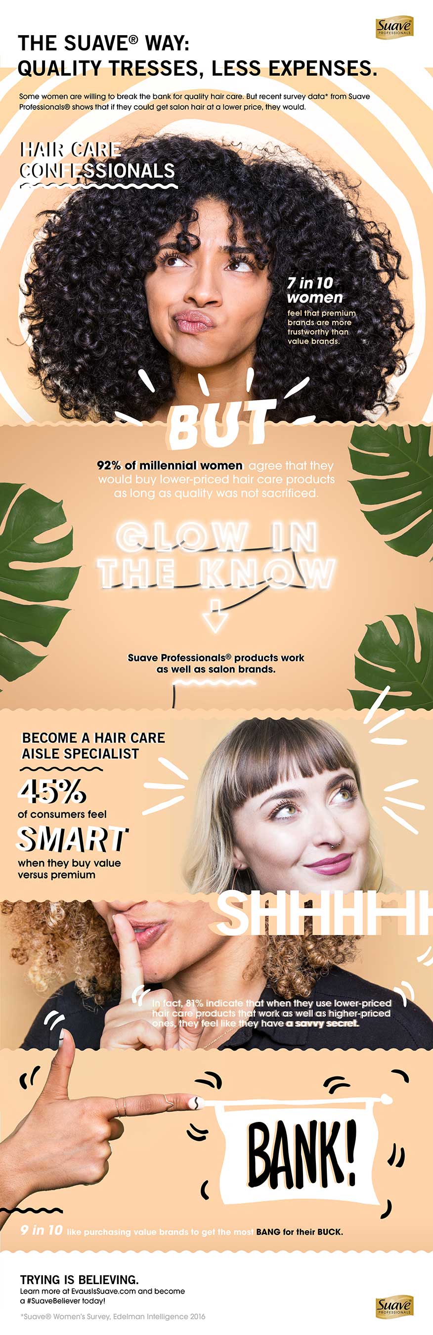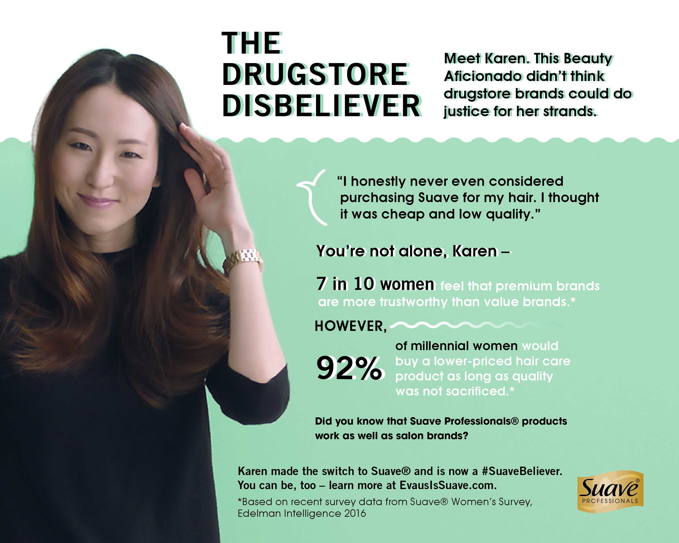 "Pedimos a las mujeres que vieran más allá de la etiqueta y reconsideraran a Suave", dijo Jennifer Bremner, directora de marketing de Suave. "Denle una oportunidad. Sabemos que las mujeres amarán su cabello y amarán también el precio que pagaron por tenerlo hermoso".