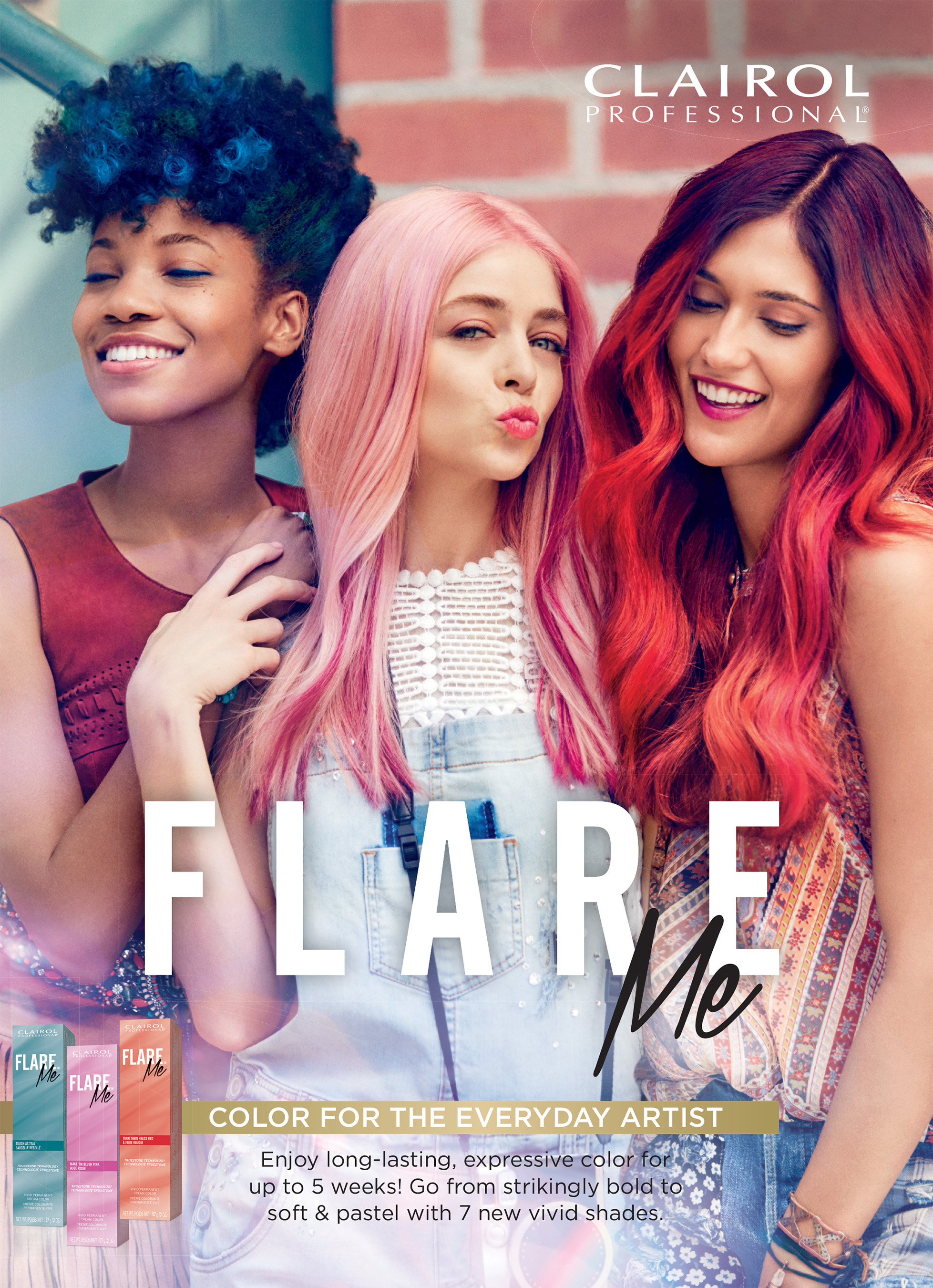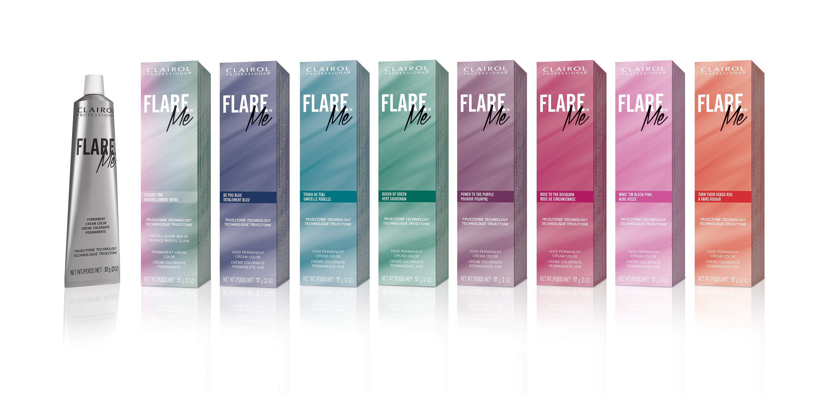 Clairol Professional, una empresa líder en productos de coloración desde hace más de 80 años, se enorgullece de presentar su primera colección de tintes en tonos vivos para la creativa hogareña. De forma similar al inicio de un proyecto nuevo, el arte de crear un tinte en casa permite a la creativa utilizar el color como un reflejo divertido y expresivo de su personalidad. “La colección FLARE Me fue desarrollada para las fanáticas de la coloración que desean cambiar estacionalmente su estilo”, afirma Carole Protat, directora creativa de Wella North America. “La amplia gama de tonos, que van del rojo al verde, azul y violeta, son personalizables para ofrecer a las clientas el tono exacto que desean”.