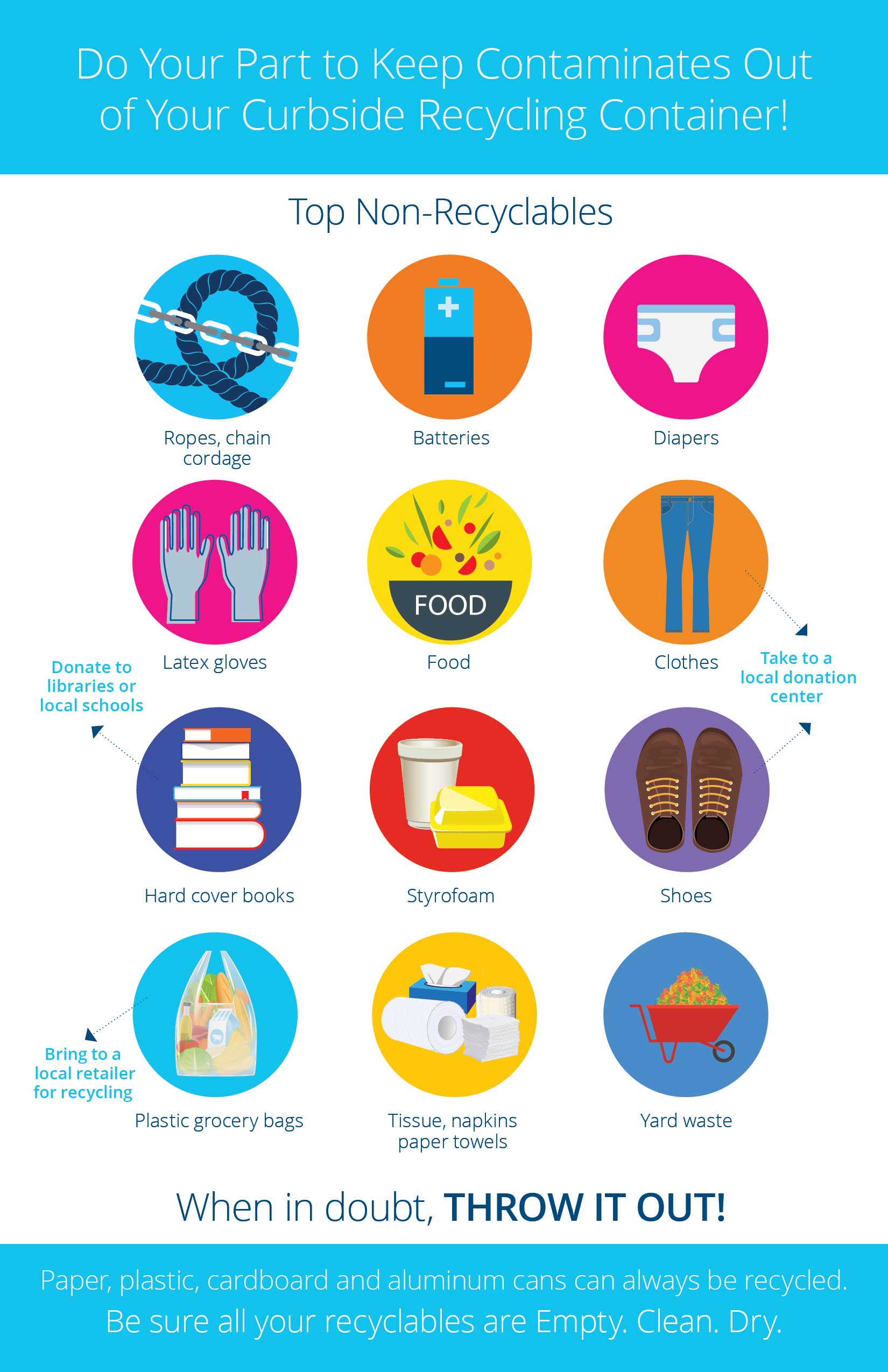 Muchos clientes dejan artículos dentro del contenedor de reciclaje con la esperanza de que sí sean reciclables. A pesar de sus buenas intenciones, les recordamos que algunos artículos no deben mezclarse con reciclables limpios. Si no hay seguridad sobre el potencial de reciclable de un artículo debemos seguir la máxima: "Si tiene dudas, mejor tírelo a la basura", es decir, deposite el artículo dudoso en el contenedor de basura.