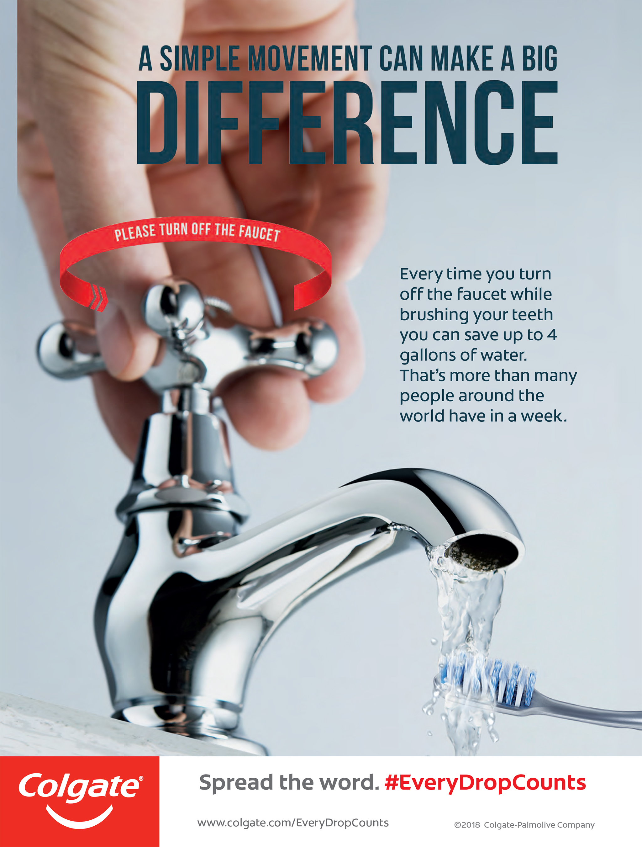 Las familias y los individuos inspirados pueden prometer que cerrarán la llave en EveryDropCounts.Colgate.com y difundir el mensaje de la conservación del agua usando #EveryDropCounts este Día Mundial del Agua y todos los días.