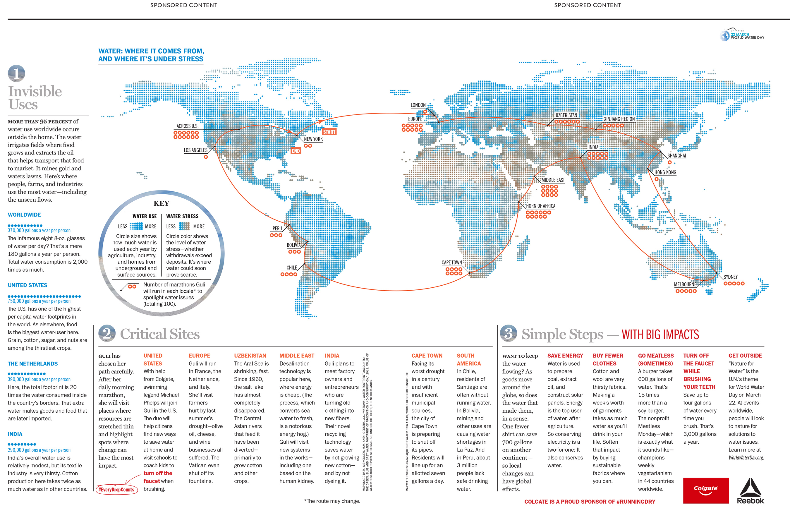 - Serie de documentales sobre el derroche de agua: Colgate está ayudando a producir una serie de documentales en los que Guli destacara el problema de la escasez de agua en el Gran Lago Salado de Utah; explicara el origen del agua en los Catskills de Nueva York, y presentara soluciones innovadoras para ayudar a la agricultura de California.
