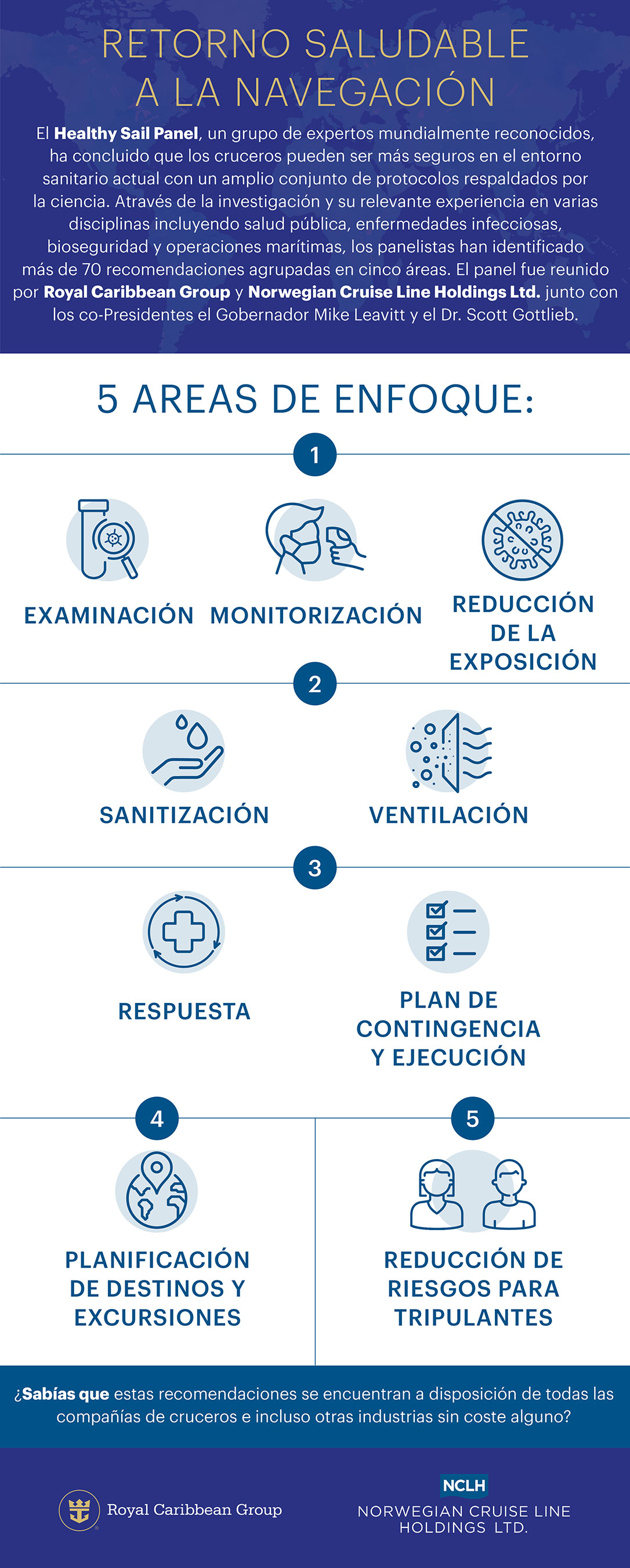 Septiembre 2020 – El Healthy Sail Panel, un grupo de expertos reconocidos mundialmente reunidos por Royal Caribbean Group y Norwegian Cruise Line Holdings Ltd., ha concluido que los cruceros pueden ser más seguros en el entorno sanitario actual con un amplio conjunto de protocolos respaldados por la ciencia. A través de la investigación y de su relevante experiencia en varias disciplinas que incluyen la salud pública, las enfermedades infecciosas, la bio seguridad, la hostelería y las operaciones marítimas, los panelistas han destatacado más de 70 recomendaciones. Echa un vistazo a las cinco áreas de enfoque que el grupo ha identificado en colaboración con los co-Presidentes el Gobernador Mike Leavitt, ex Secretario de Salud y Servicios Sociales de EE.UU. y el Dr. Scott Gottlieb, ex Comisario de la Administración de Alimentos y Medicamentos.