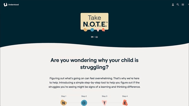 "Los signos de las diferencias en la manera de pensar y aprender no siempre son claros, y no saber qué significan o cómo ayudar puede ser estresante y abrumador", dijo Fred Poses, presidente y director ejecutivo de Understood. “Ahora que los niños regresan a un entorno escolar incierto, las familias necesitan una herramienta que les ayude a darse cuenta de si sus hijos tienen dificultades. Al ofrecer recursos gratuitos y fáciles de usar, nuestro objetivo con la herramienta Take N.O.T.E. es ayudar a los cuidadores a tomar el control, identificar las señales e interactuar con expertos de confianza para obtener la orientación que necesitan".
