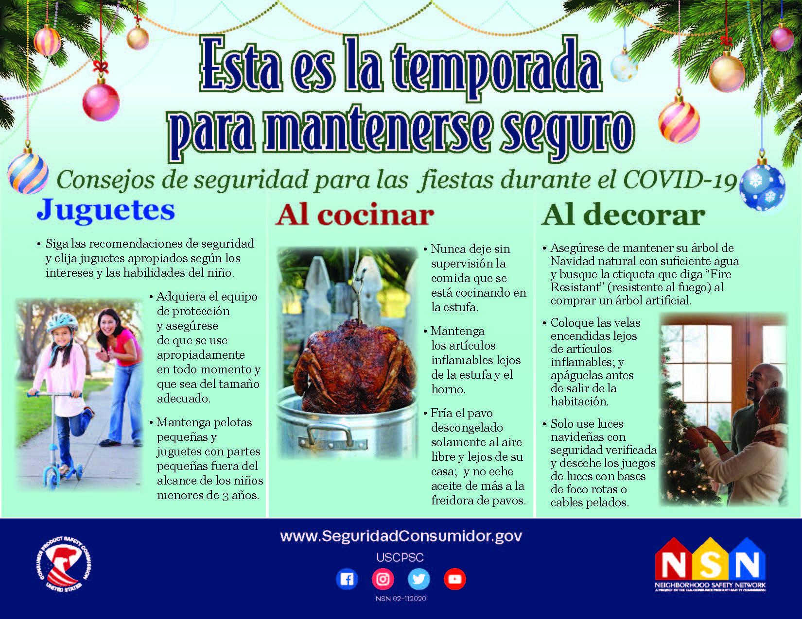 WASHINGTON, D.C. – Las fiestas normalmente son una temporada especial para reunirse en familia y con amigos. Sin embargo, puede ser que muchas celebraciones se lleven a cabo de forma virtual este año dada la pandemia. Cualquiera que sea la manera en que celebre los días festivos, es importante que se proteja de los posibles peligros asociados con los árboles de Navidad, las velas y los incendios en la cocina, así como de los juguetes inseguros.