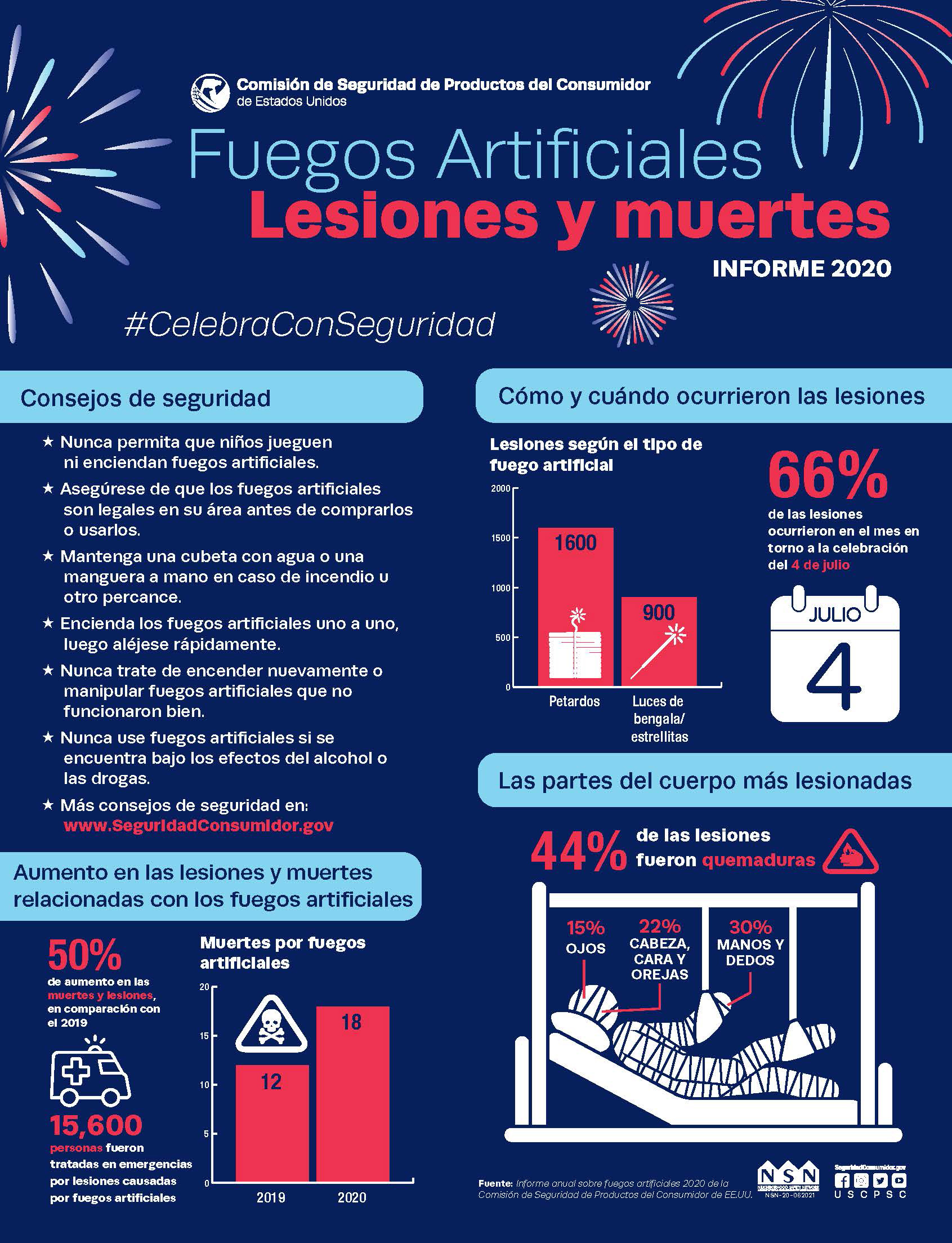 Un nuevo informe (en inglés) de la Comisión de Seguridad de Productos del Consumidor de EE. UU. (U.S. Consumer Product Safety Commission, CPSC) resaltó un aumento del 50% en las muertes y lesiones por incidentes relacionados con fuegos artificiales en 2020, en comparación con 2019.