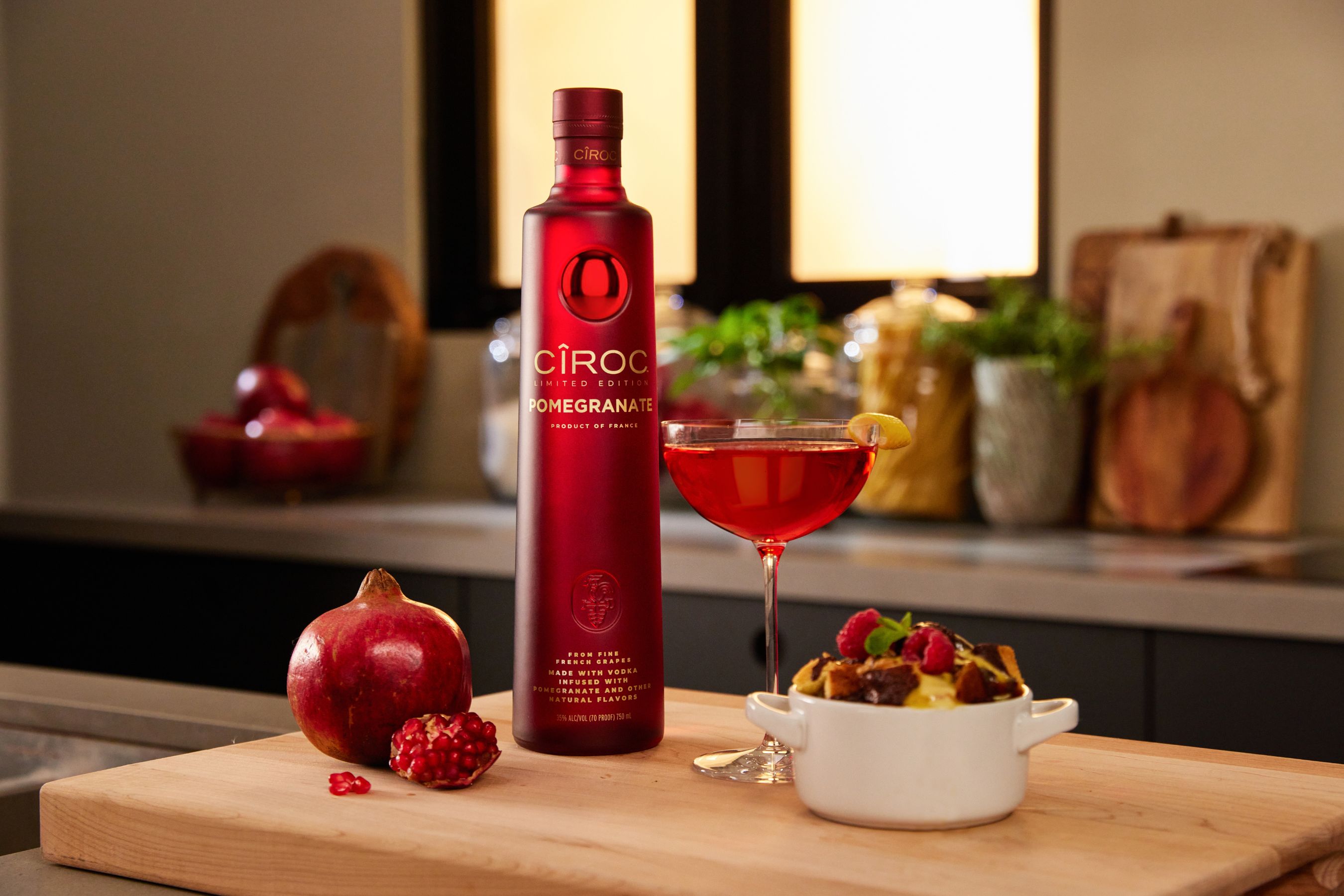 CÎROC Pomegranate Jewel en conjunto con algunos utensilios esenciales para preparar el clásico postre del Chef Richard, el Chocolate Toffee Bread Pudding servido con Creme Anglaise. El pudding es una versión elevada del pudding de pan típico que se sirve durante la temporada festiva con ingredientes que complementan los sabores jugosos de la Pomegranate Jewel. Disponible durante un tiempo limitado únicamente, y hasta durar existencias, el