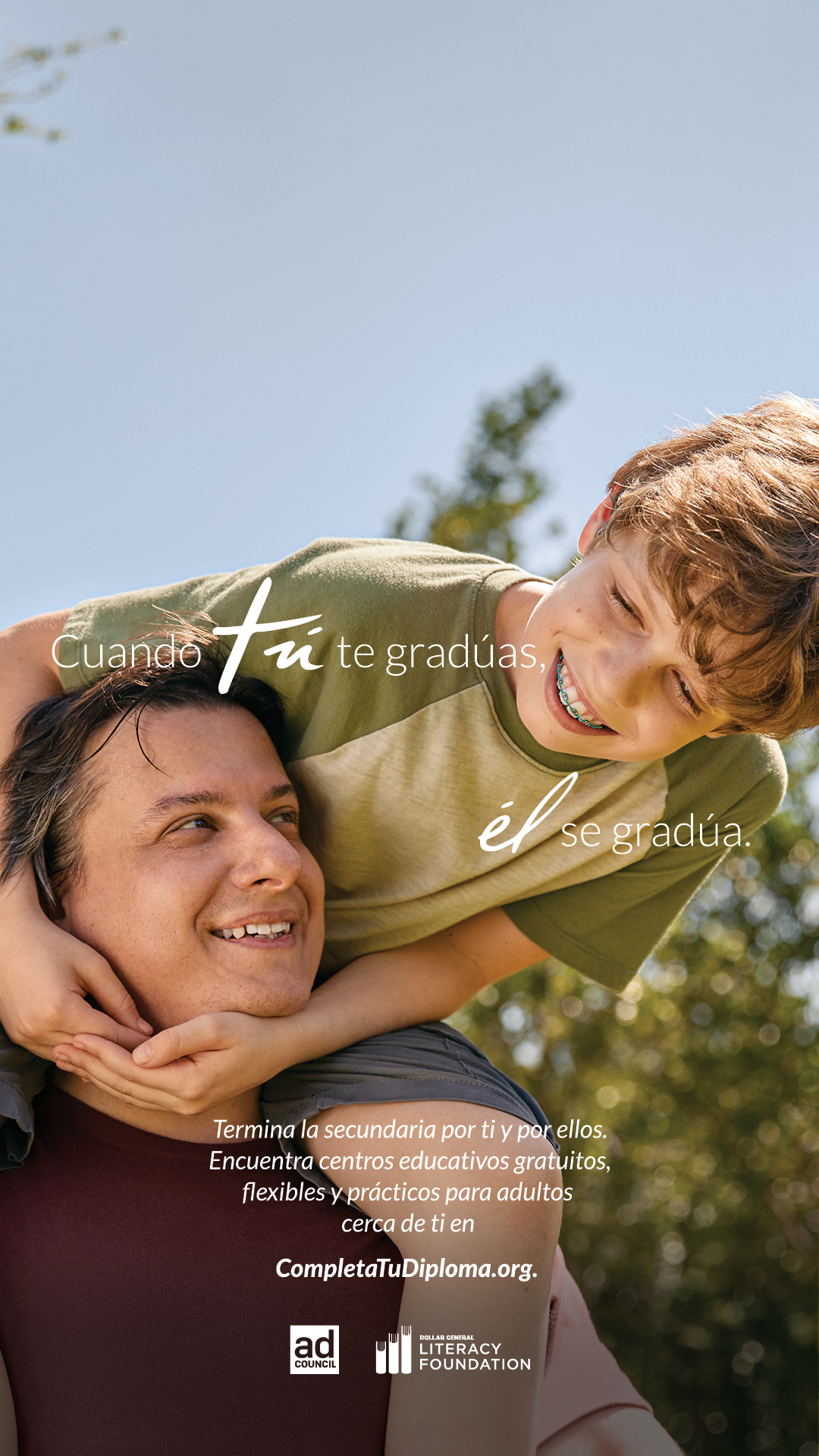 La campaña Finish Your Diploma es una colaboración exitosa y de larga data entre DGLF y El Ad Council. Desde que se lanzó la campaña original en 2010, ha brindado a 1.8 millones de estadounidenses la información que necesitan para inscribirse en clases gratuitas de educación para adultos en CompletaTuDiploma.org. La campaña cuenta con el apoyo de la consolidada agencia de medios Starcom, que está ampliando el alcance de sus últimos trabajos creativos a través de medios donados por múltiples socios de medios de comunicación.