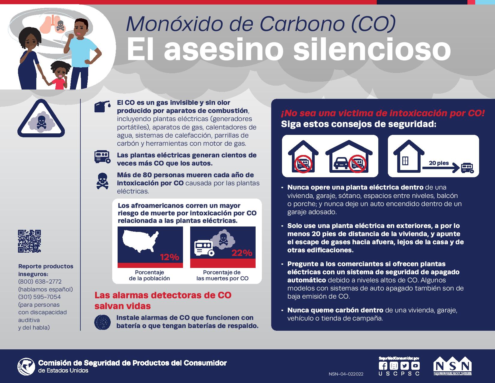 La CPSC estima que unos 80 consumidores mueren en Estados Unidos cada año por envenenamiento con CO causado por plantas eléctricas. El último informe de la CPSC (en inglés) muestra que los afroamericanos corren un mayor riesgo y representan el 22% de las muertes por CO relacionadas con plantas eléctricas entre 2010 y 2020, casi el doble de su participación estimada del 13% en la población total de EE. UU.
