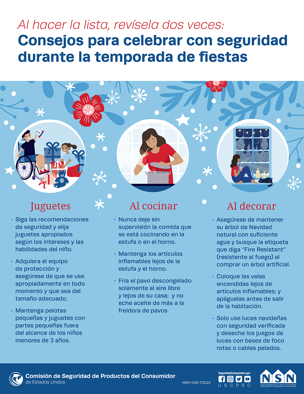 WASHINGTON, D.C., 21 de noviembre de 2022 – Con los días festivos a la vuelta, la Comisión de Seguridad de Productos al Consumidor de EE. UU. (U.S. Consumer Product Safety Commission, CPSC) les recuerda a los consumidores que prioricen la seguridad en esta temporada. Se pueden prevenir muchas lesiones y muertes asociadas con la celebración de las fiestas, por lo que se insta a los consumidores a poner en práctica la seguridad al comprar juguetes para los niños, cocinar festines o decorar su hogar.