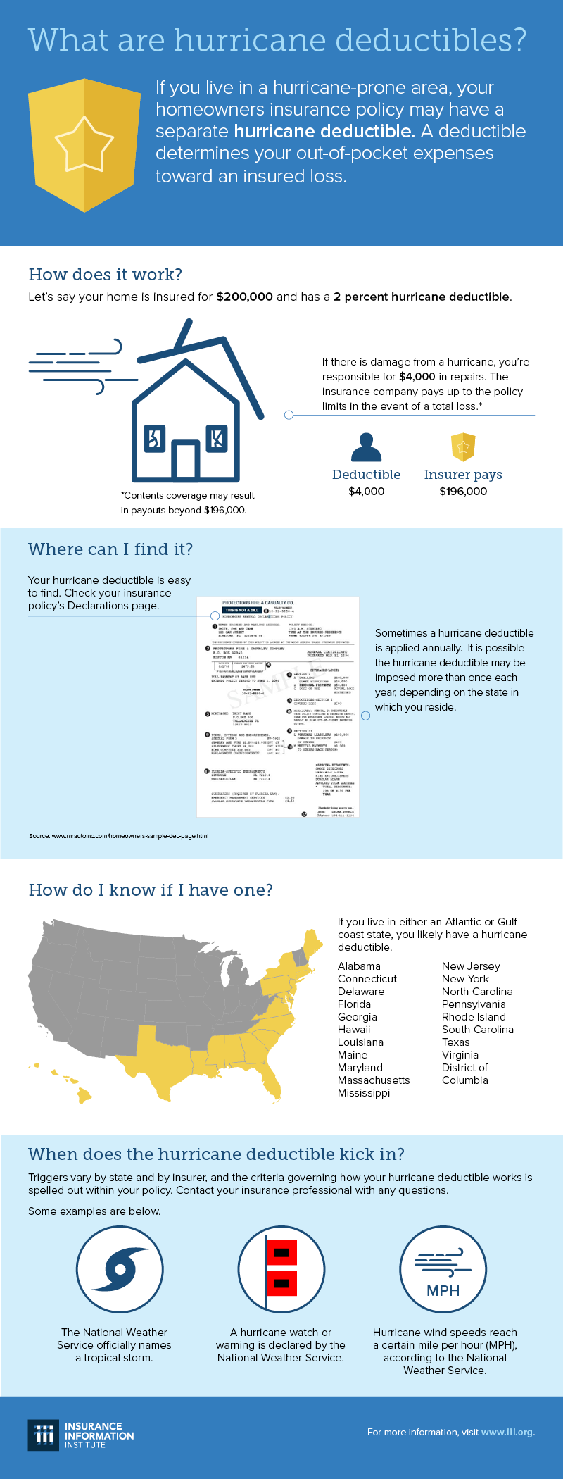 Las pólizas de seguro estándar para propietarios e inquilinos cubren los daños materiales causados por vendavales, como los huracanes. Los daños causados a una vivienda, a las pertenencias de un inquilino o a un negocio por inundaciones o mareas de tempestad están cubiertos por una póliza de seguro de inundación, que suele ser independiente de la póliza de seguro de vivienda, alquiler o negocio. Los daños materiales a las empresas provocados por vientos huracanados suelen estar cubiertos por una Póliza de propietario de negocio (BOP) o a una Póliza de múltiples riesgos comerciales (CMP).