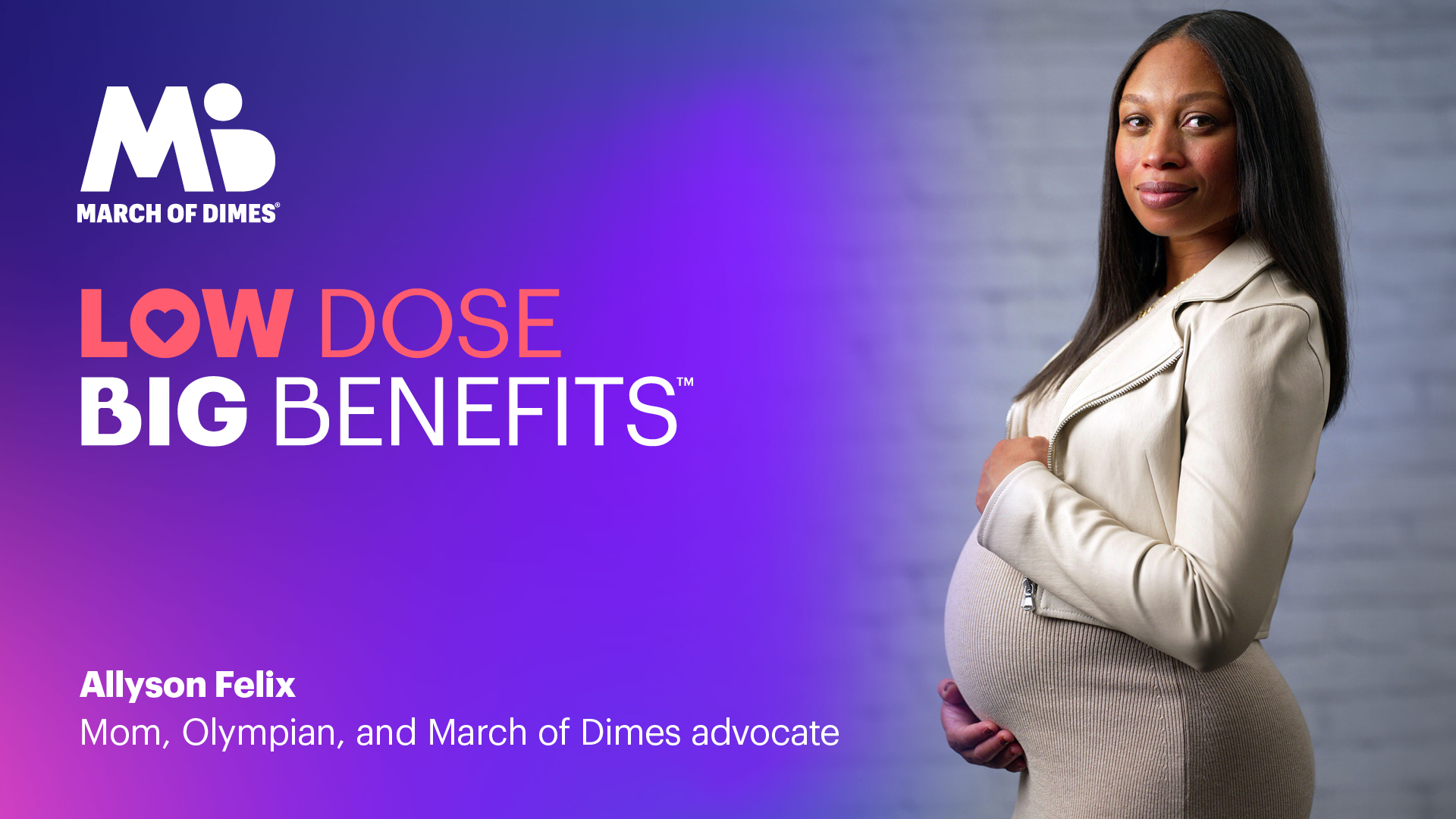 ARLINGTON, Virginia, 2 de mayo de 2024 -- March of Dimes, la organización líder que lucha por la salud de todas las mamás y los bebés, anunció hoy el lanzamiento de Low Dose, Big Benefits (dosis bajas, grandes beneficios), una campaña de varios años destinada a disminuir los efectos adversos de la preeclampsia y el parto prematuro mediante el uso de aspirina en dosis bajas. La nueva campaña contará con la participación de la empresaria y atleta olímpica estadounidense Allyson Felix como embajadora de la marca y forma parte de la plataforma It Starts With Mom de March of Dimes, que ofrece a las familias información y recursos educativos durante el embarazo. It Starts With Mom cuenta con el generoso apoyo de socios de confianza, como HCA Healthcare, Clearblue, Goldbug, The Honest Company, Philips Avent y Sanofi.