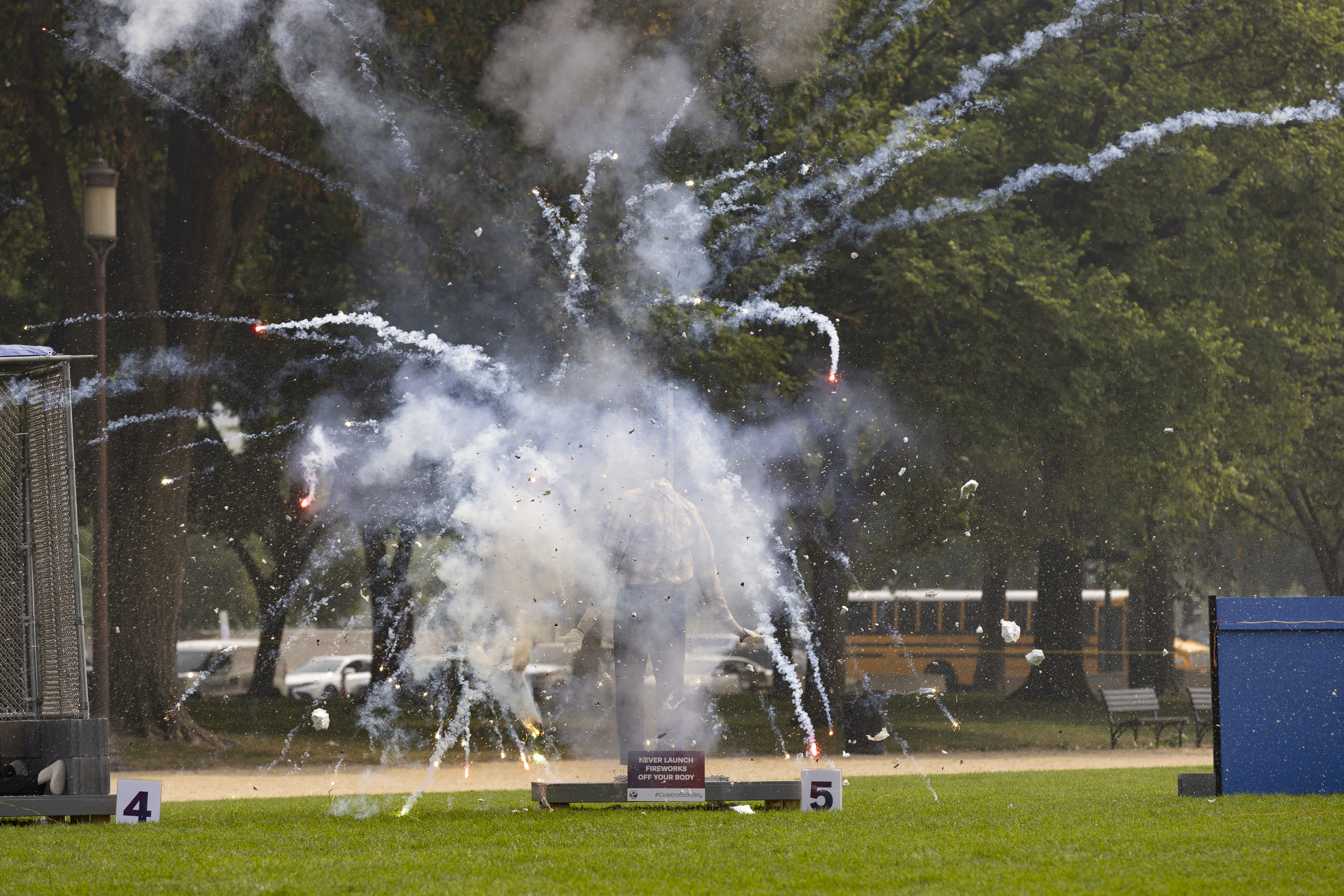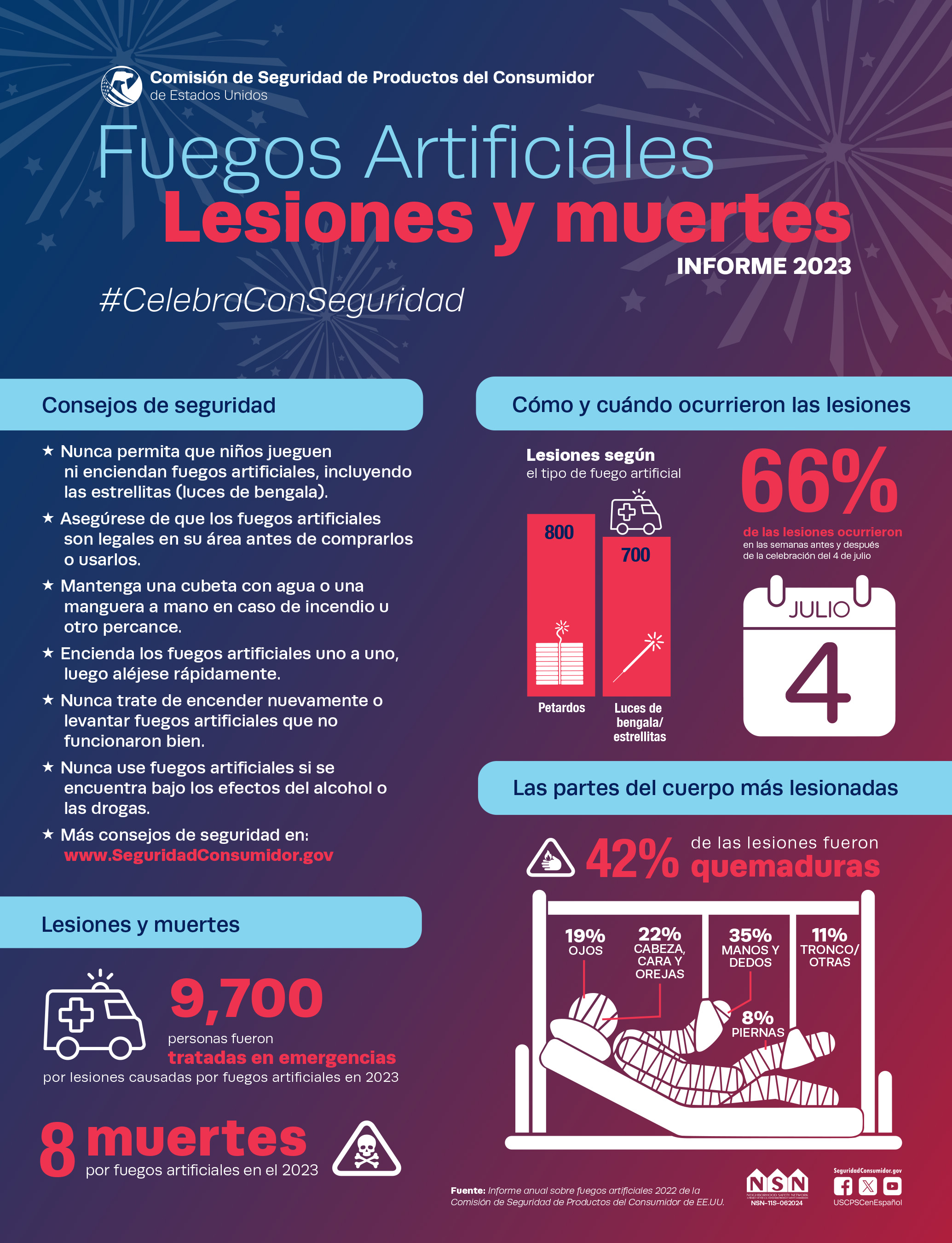 En el 2023, la CPSC recibió reportes de ocho muertes y unas 9,700 lesiones vinculadas a los fuegos artificiales. De las ocho muertes, cinco se asociaron con el uso indebido de fuegos artificiales, dos con el mal funcionamiento de un dispositivo y una se asoció con circunstancias desconocidas.