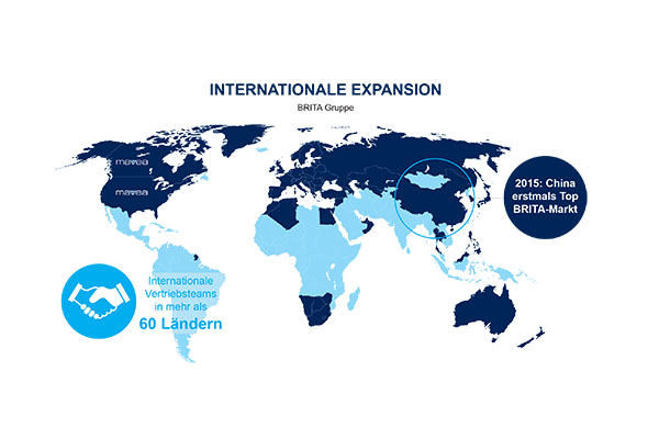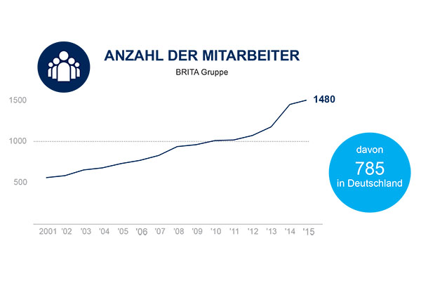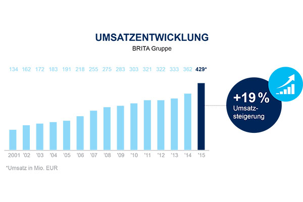 In 2015 erzielte die BRITA Gruppe mit ihren 23 nationalen und internationalen Tochtergesellschaften bzw. Betriebsstätten, 4 Produktionsstätten und Vertreibern in über 60 Ländern auf allen fünf Kontinenten einen Gesamtumsatz von 429 Mio. Euro (währungsbereinigt 410 Mio Euro). Das bedeutet ein Wachstum von 19 Prozent gegenüber Vorjahr (2014: 361 Mio. Euro). Unverändert wurden 82 Prozent des Gesamtumsatzes außerhalb Deutschlands erzielt.