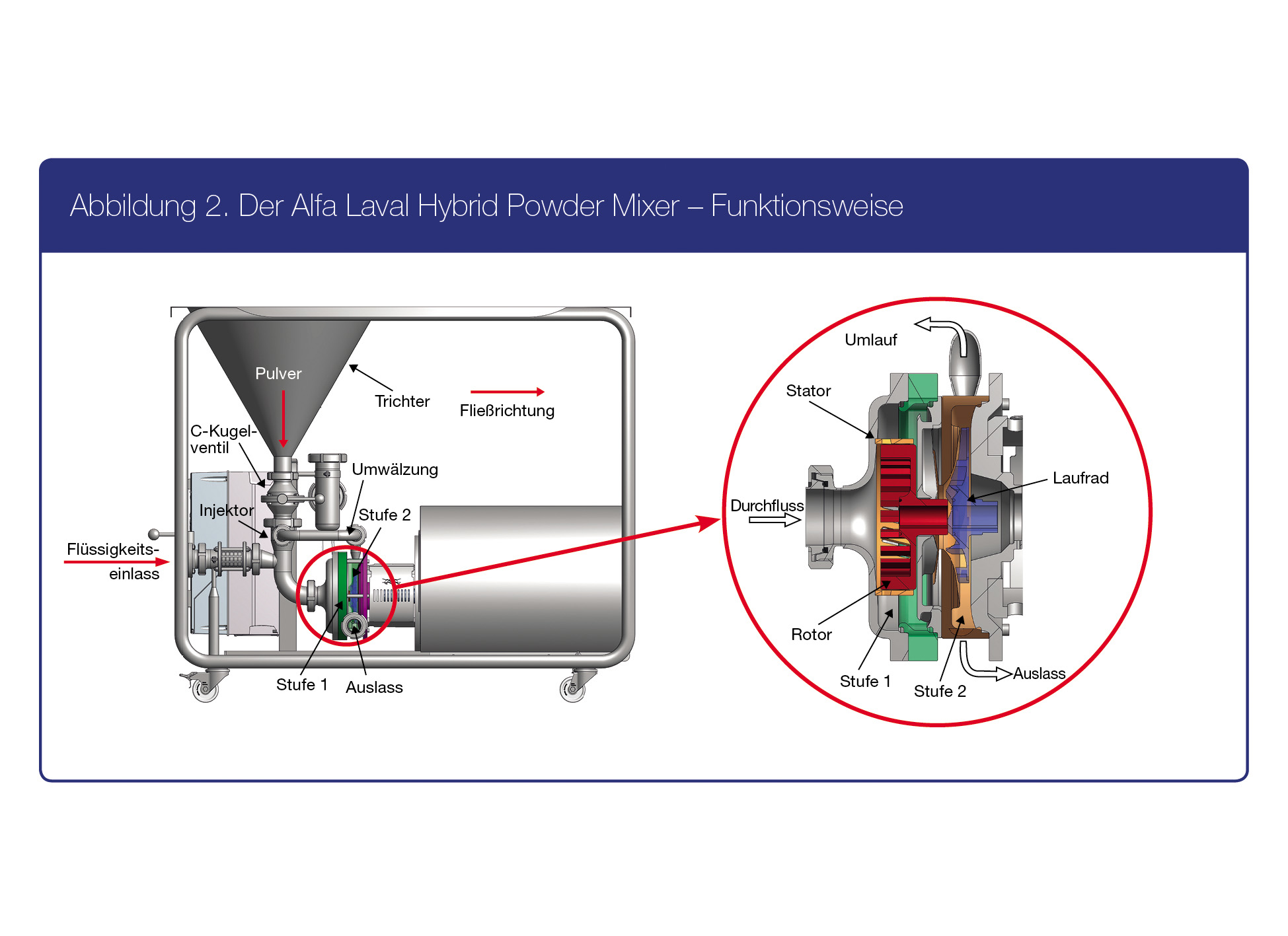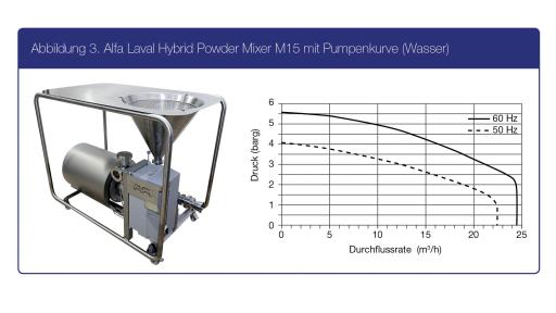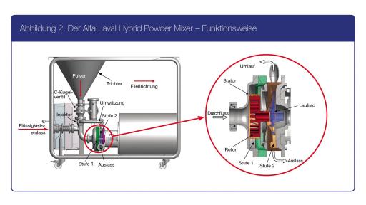 Im Gegensatz zu konventionellen Pulvermischern baut der Hybrid-Pulvermischer von Alfa Laval in drei Schritten mit nur einer Motorwelle eine hohe dynamische Scherkraft auf (Abbildung 2). Dadurch wird für die restlose Auflösung des Pulvers weniger Energie benötigt. Der Hybrid-Pulvermischer von Alfa Laval umfasst eine einzigartig konstruierte Zwei-Stufen-Pumpe, eine hohe Scherstufe und eine Pumpenstufe mit einem Motor mit Frequenz-Umrichter. Die Pumpe ermöglicht einen Förderdruck von bis zu 4 bar ohne Zuhilfenahme einer weiteren Pumpe. Darüber hinaus treibt sie auch den Umwälzkreislauf zum Mischtank an (Abbildung 3).