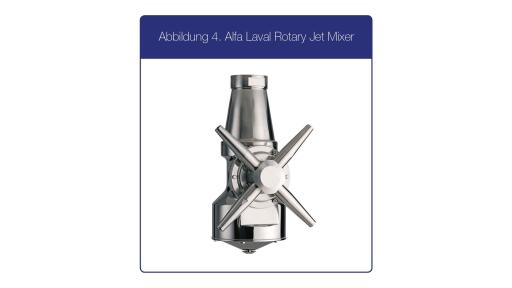 Die auf dem Umwälzkreislauf im Mischtank installierte rotierende Vorrichtung mit vier Düsen, der Alfa Laval Rotations-Jetkopf-Mischer (Abbildung 4), wird vom Produktfluss und durch den Druck vom Hybrid-Pulvermischer angetrieben. Der Alfa Laval Rotations-Jetkopf-Mischer kann die anspruchsvollsten Pulvermedien verteilen und gewährleistet die Homogenität des Produkts ohne Zuhilfenahme eines Rührwerks. Es handelt sich um eine höchst effektive Tankreinigungsmaschine für den Mischtank, die Zeit spart, den Energieverbrauch reduziert und die Produktionsleistung steigert.