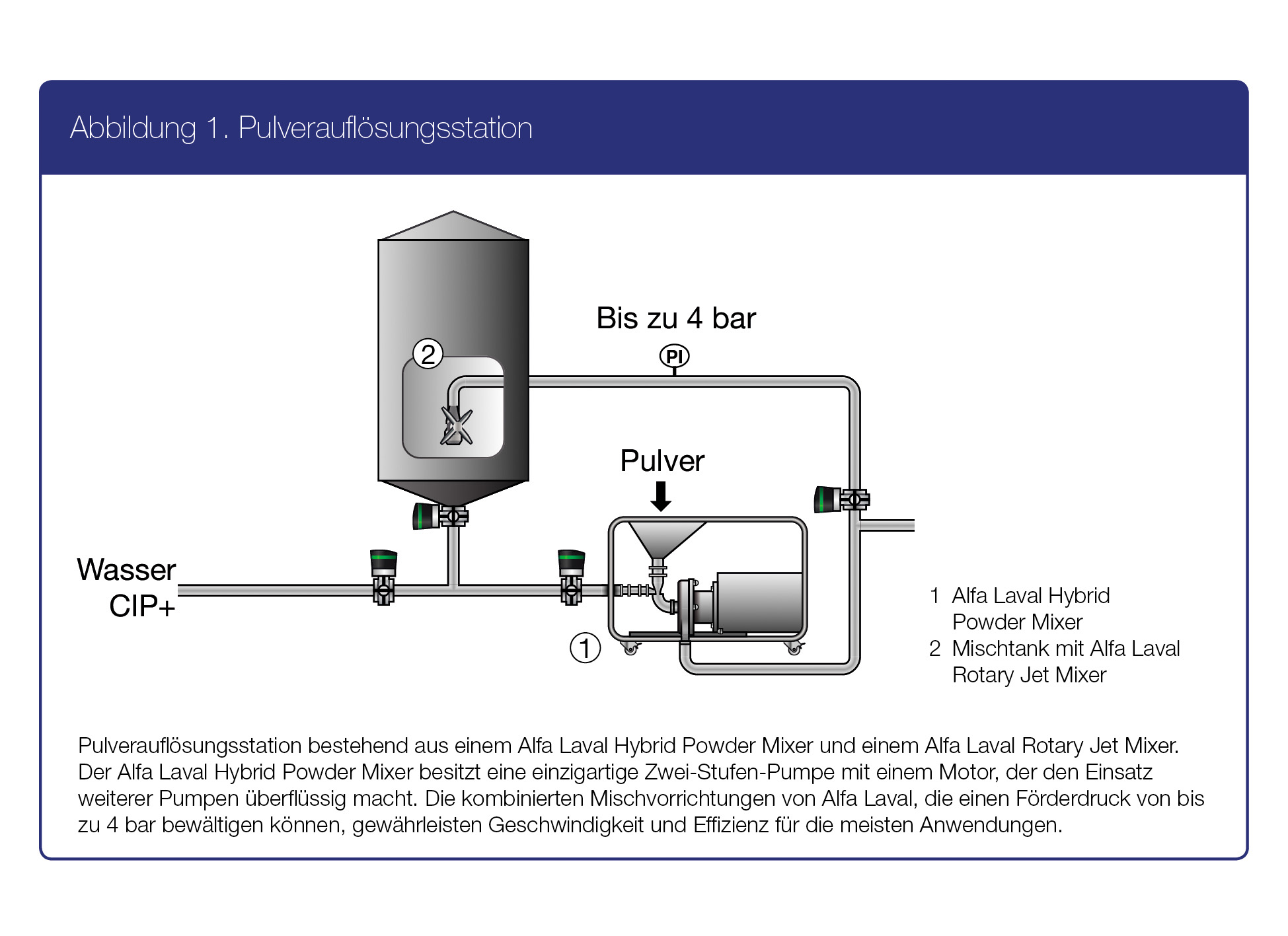 Der Hybrid-Pulvermischer von Alfa Laval wirkt in Verbindung mit dem Alfa Laval Rotations-Jetkopf-Mischer auf innovative Weise Problemen bei der Pulverdispersion entgegen. Lebensmittelproduzenten profitieren von der optimalen Mischeffizienz und niedrigen Gesamtbetriebskosten. Durch Kombination der beiden Einheiten zu einem einzelnen, hocheffizienten System ermöglicht Alfa Laval die unverzügliche und einheitliche Dispersion auch der anspruchsvollsten pulverförmigen Zutaten mit nur einem Motor. Nach Abschluss des Mischzyklus kann dasselbe System auch zur Entleerung und Reinigung des Tanks verwendet werden (Abbildung 1).