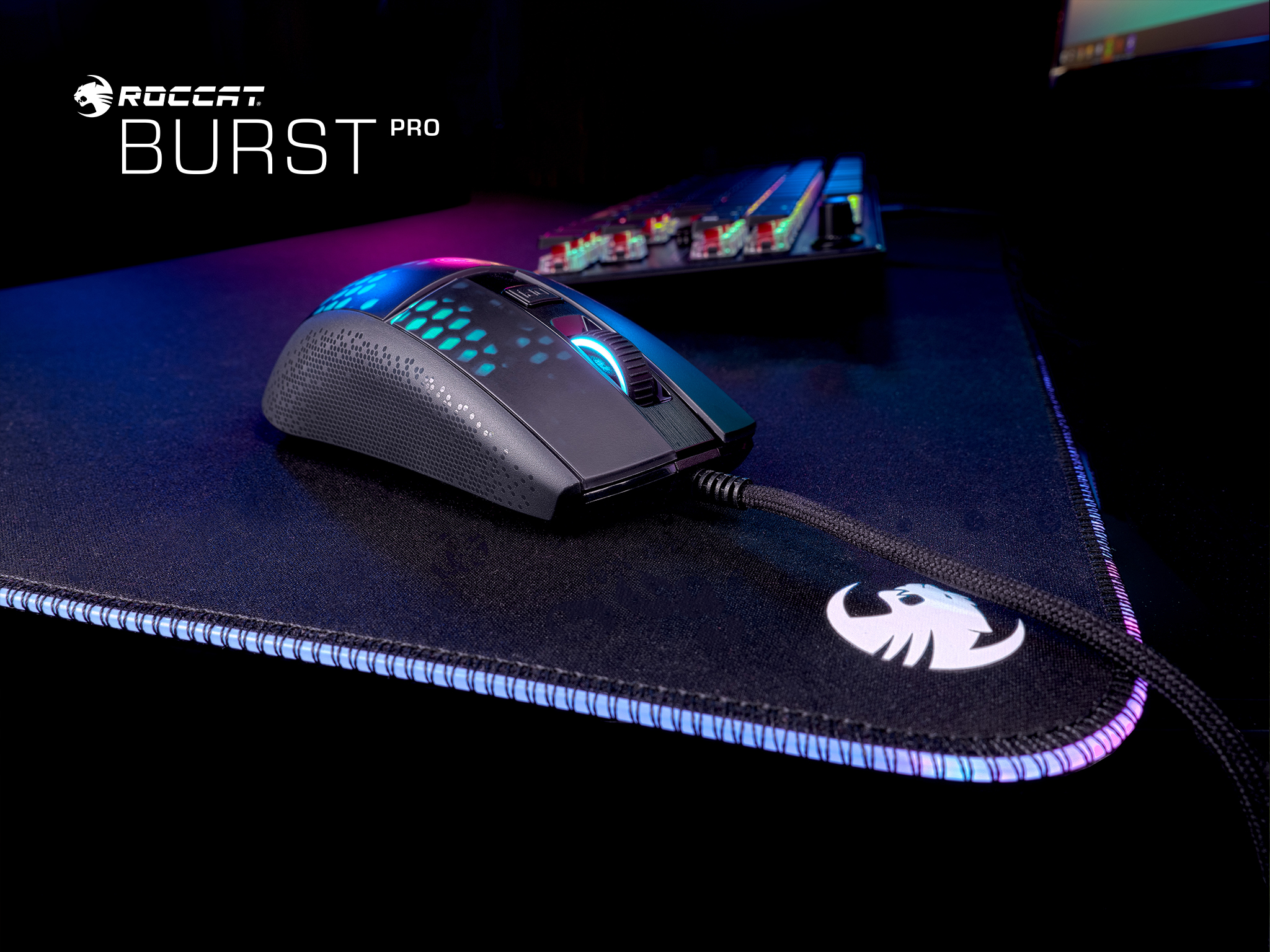 Ebenfalls mit ROCCATs Titan Switch Optical ausgestattet, ist die Burst Pro eine der reaktionsschnellsten Gaming-Mäuse auf dem Markt. Geschwindigkeit, Leistung und Zuverlässigkeit im Fokus, setzt ROCCAT bei dieser Maus auf ein ganz neues Shape: Leicht, symmetrisch und doch ergonomisch. Der eingebaute ROCCAT Owl-Eye Optical Sensor mit einstellbaren 16.000 dpi steht für bestmögliche Performance. Eine hochwertige Oberfläche bedeckt die integrierte Wabenkonstruktion, welche das Gewicht auf nur 68 Gramm reduziert. Die lichtdurchlässige Oberseite setzt die AIMO-Lichteffekte perfekt in Szene. Die Burst Pro wird für einen UVP von 59,99 Euro erhältlich sein.