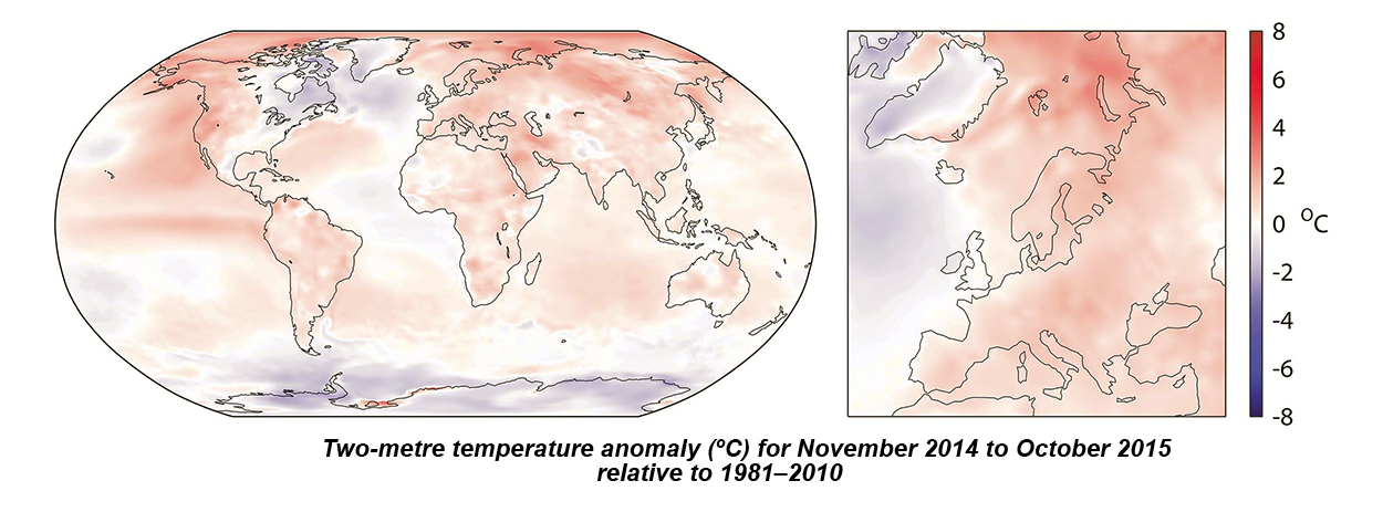 - Nuevos datos de Copernicus confirman que el periodo de 12 meses que finaliza en octubre de 2015 registra las temperaturas más calurosas.