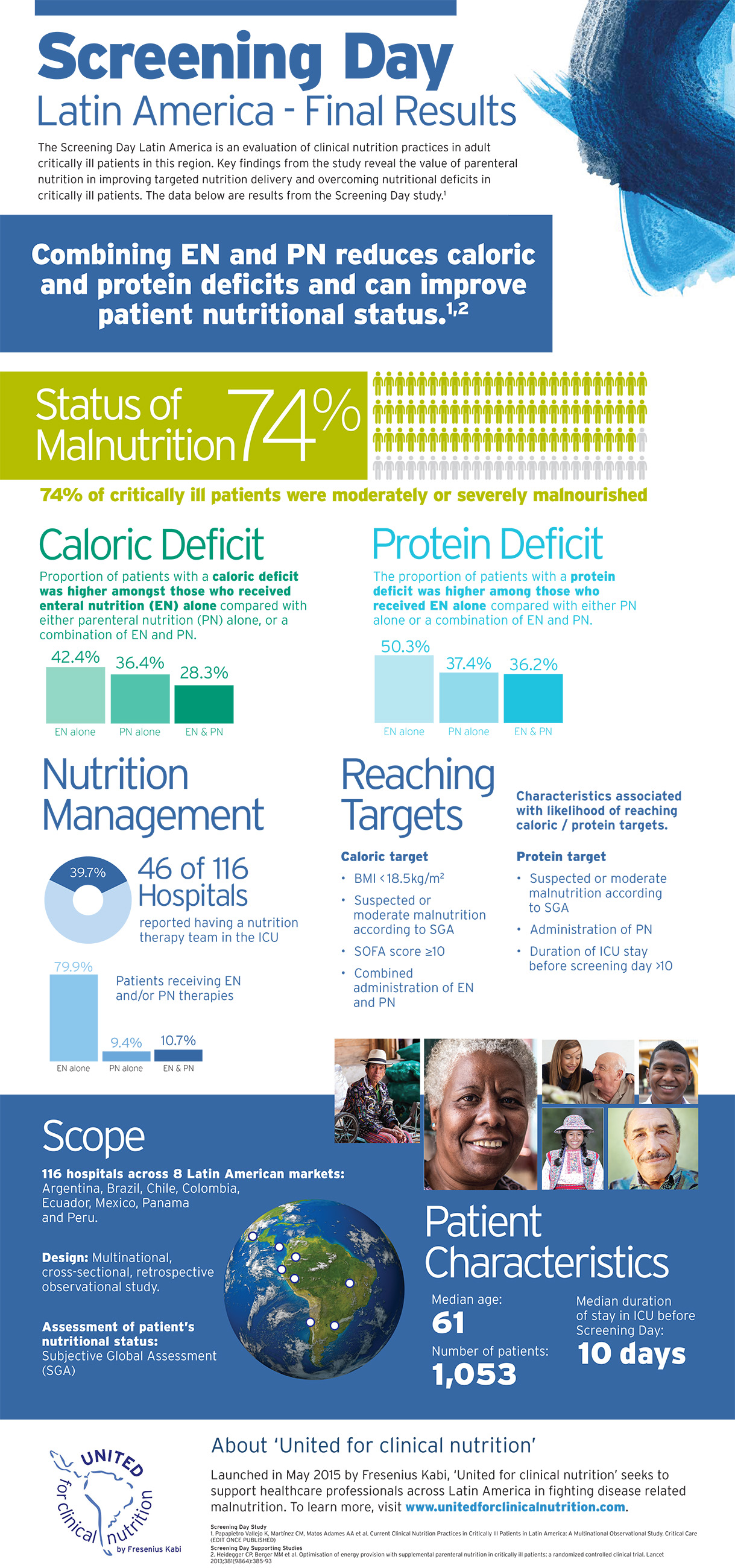 En 2015, Fresenius Kabi condujo el Screening Day en América Latina en 116 hospitales de América Latina. Los resultados revelaron que hasta el 74 % de los pacientes en estado grave de los hospitales de América Latina presentan desnutrición.1 En esta región, y en todo el mundo, la desnutrición suele pasar desapercibida y no se trata, lo que produce resultados desfavorables para los pacientes.2,3