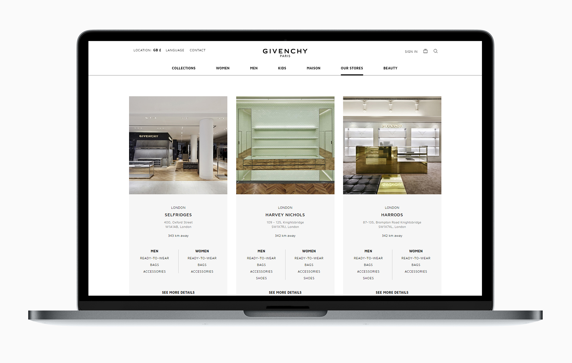 De acuerdo con la estrategia omnichannel de Givenchy, la principal característica de esta plataforma permite a los clientes comprobar la disponibilidad de stock en las tiendas minoristas de la marca, elegir entregas en la tienda de las compras realizadas en línea (hacer clic y cobrar) y reservar una cita en la tienda para probarse la ropa.