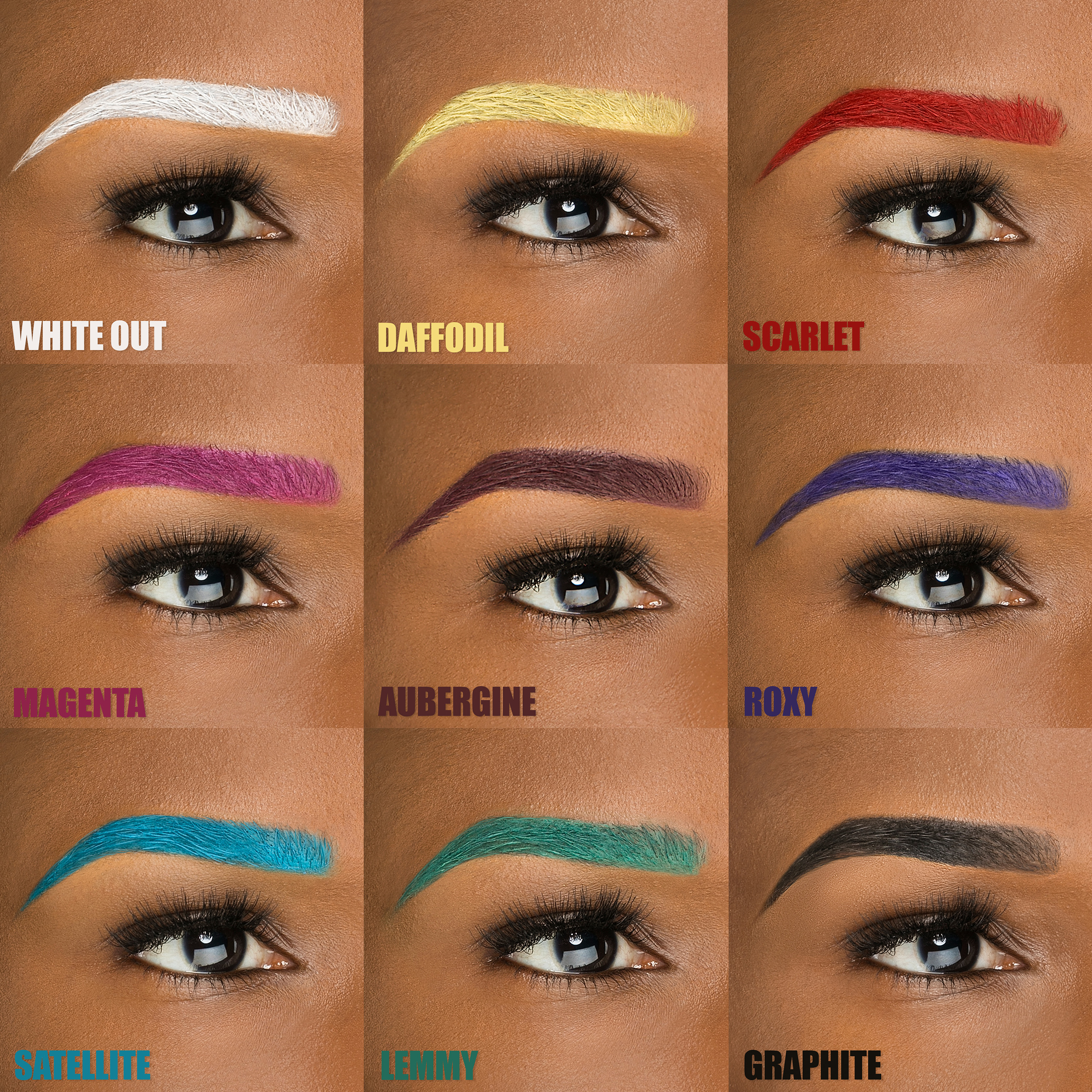 "¡No hay que tenerle miedo a las cejas de colores! La versatilidad de los tonos de la Pomada para Cejas Duradera 24-Hour Super Brow es fantástica para la creatividad. Por ejemplo: el color Scarlet mezclado con cualquiera de los otros tonos marrones permite obtener el tono cobrizo perfecto, y el Bleach crea las cejas decoloradas más rápidas y sin compromiso a largo plazo de la historia. Utilicé solamente el tono Scarlet para crear este look divertido y lleno de color".
