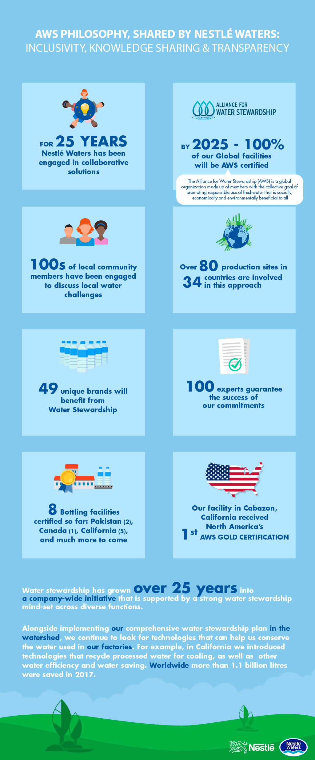 El estándar mundial promueve el uso responsable del agua que beneficia a las comunidades locales social y económicamente, al tiempo que garantiza la sostenibilidad ambiental de las cuencas, siendo todos estos temas prioridades para Nestlé. Desde el primer anuncio de su compromiso con el estándar AWS en 2017, Nestlé Waters ha certificado ocho de sus fábricas en todo el mundo, incluidas Pakistán, Canadá y los Estados Unidos.