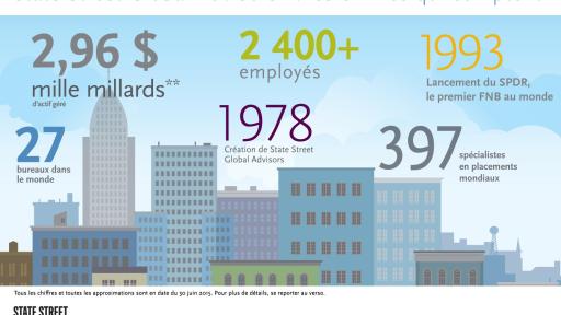 Depuis près de quatre décennies, la société State Street Global Advisors est déterminée à assister les spécialistes du domaine financier et ceux qui comptent sur eux pour atteindre leurs objectifs en matière d'investissement. Nous formons des partenariats avec des institutions et des spécialistes du secteur financier afin de les aider à atteindre leurs objectifs, au moyen d'un processus rigoureux et axé sur la recherche rejoignant à la fois les disciplines actives et indicielles. Nous sommes fiers de travailler étroitement avec nos clients dans le but de mettre au point des stratégies précises d'investissement, notamment notre gamme avant-gardiste de FNB SPDR. Notre actif géré de l'ordre de quelque mille milliards de dollars**, notre envergure et notre présence à l'échelle mondiale nous procurent un accès sans égal aux marchés et aux catégories d'actifs, en plus de nous permettre de dispenser des conseils éclairés et de procurer des solutions d'investissement spécialisées.