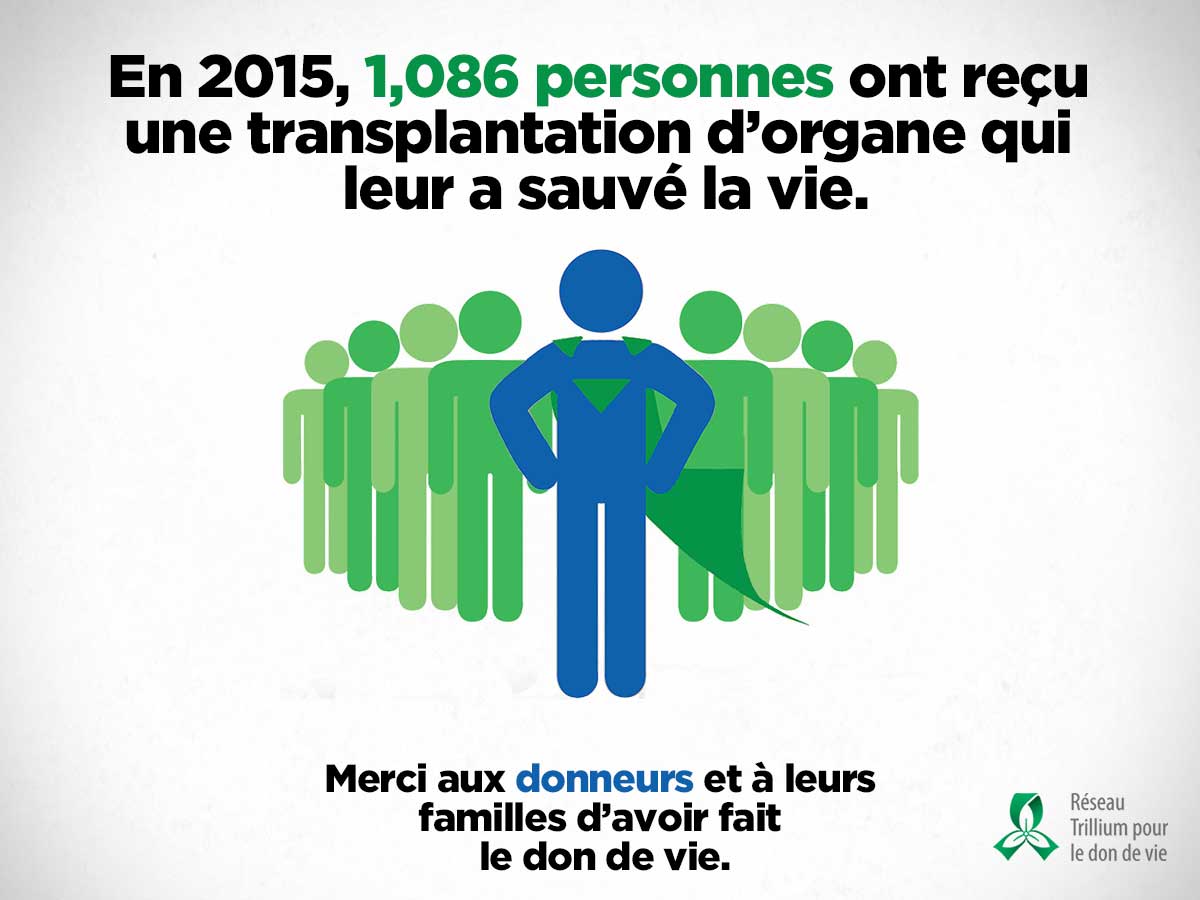 En 2015, 269 donneurs décédés et 279 donneurs vivants ont fait le don de vie à 1 086 receveurs. En outre, plus de 2 100 donneurs de tissus ont permis d’améliorer la vie de milliers de personnes en faisant don de leurs yeux, leurs os, leur peau ou leurs valvules cardiaques.