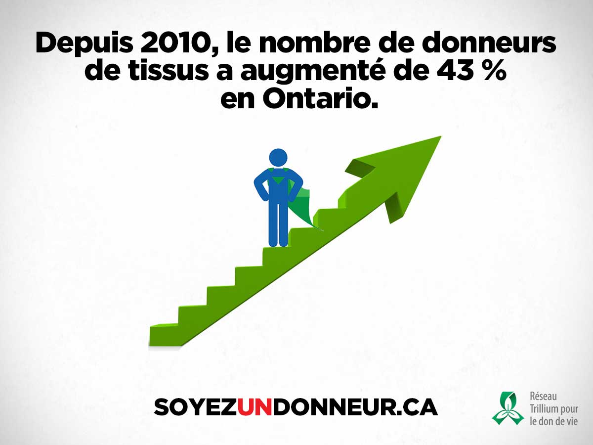 « C’est le moment idéal pour joindre les 3,4 millions d’Ontariens qui se sont fièrement inscrits comme donneurs d’organes et de tissus », affirme le Dr Eric Hoskins, ministre de la Santé et des Soins de longue durée de l’Ontario. « La procédure d’inscription ne prend que deux minutes sur www.SoyezUnDonneur.ca. Un seul donneur peut sauver jusqu’à huit vies et en améliorer jusqu’à 75 grâce au don de tissus. Pourquoi ne pas sauver une vie quand on le peut? »