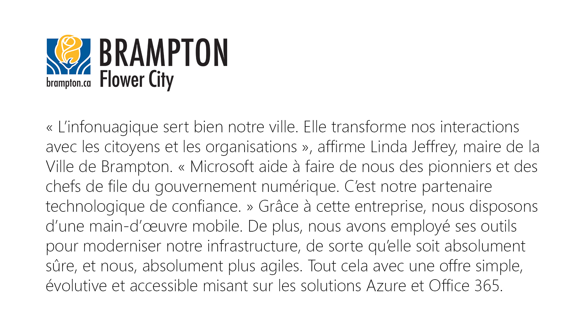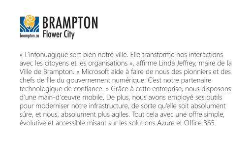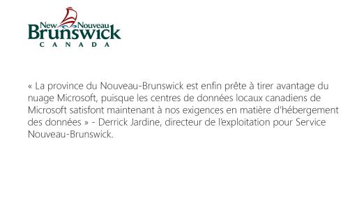 Cet accent mis sur la conformité et sur la résidence locale a incité de nombreux clients du secteur public à se tourner vers le nuage Microsoft au Canada, notamment la province de la Nouvelle-écosse, la province du Nouveau-Brunswick, la ville de Regina et la ville de Brampton. « Travailler avec Microsoft est une formidable occasion pour la Nouvelle-écosse. Nous encourageons l’innovation et nous sommes ravis de faire parti de l’ouverture des nouveaux centres de données canadiens de Microsoft. Nous déplacerons plus de 35 000 utilisateurs vers le nuage canadien de Microsoft dans les années à venir. La Nouvelle-écosse continue d’être un chef de file innovant au Canada dans de nombreux domaines, et cette solution soutien ce type de pensée visionnaire », a déclaré Labi Kousoulis, ministre des Services internes de la Nouvelle-écosse.