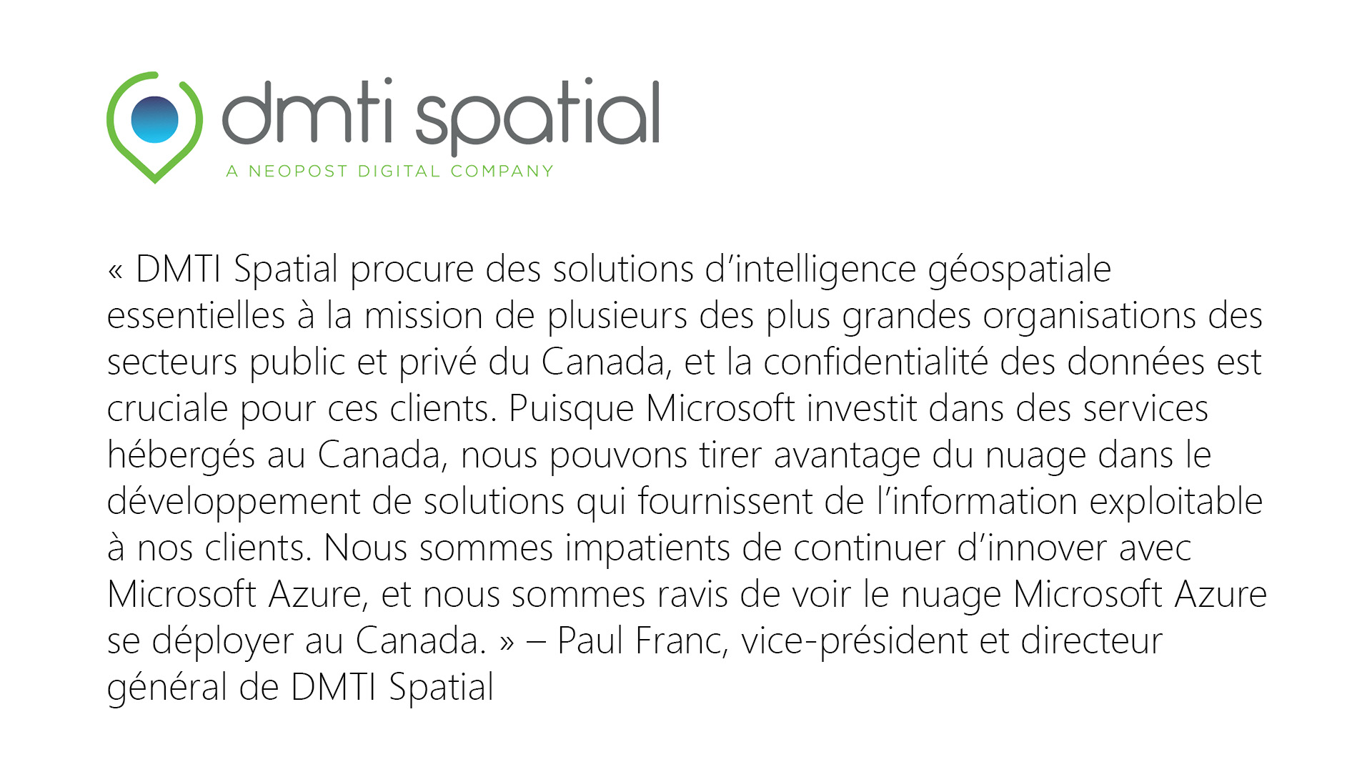 Pour Stratiform, un fournisseur canadien de solutions infonuagiques, le nuage Microsoft permet à l’entreprise de répondre aux évolutions constantes des besoins de ses clients. « L’annonce de l’ouverture de nouveaux centres de données Microsoft au Canada nous fournit une formidable occasion d’accroître notre clientèle canadienne », a affirmé Justin Kurtenback, conseiller principal de Stratiform. « Le nuage permet aux entreprises de développer l’innovation et d’opérer des transformations au sein des entreprises. Le nouveau nuage Microsoft au Canada permet d’enlever une barrière essentielle qui nous empêchait de travailler dans de grands secteurs du marché canadien et d’élargir notre offre pour des entreprises internationales. »