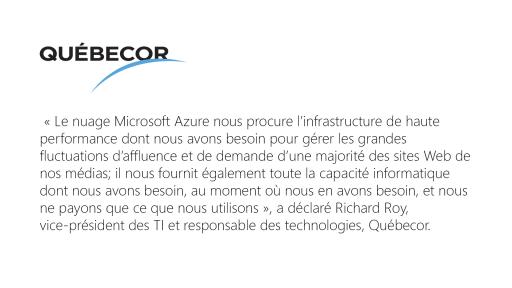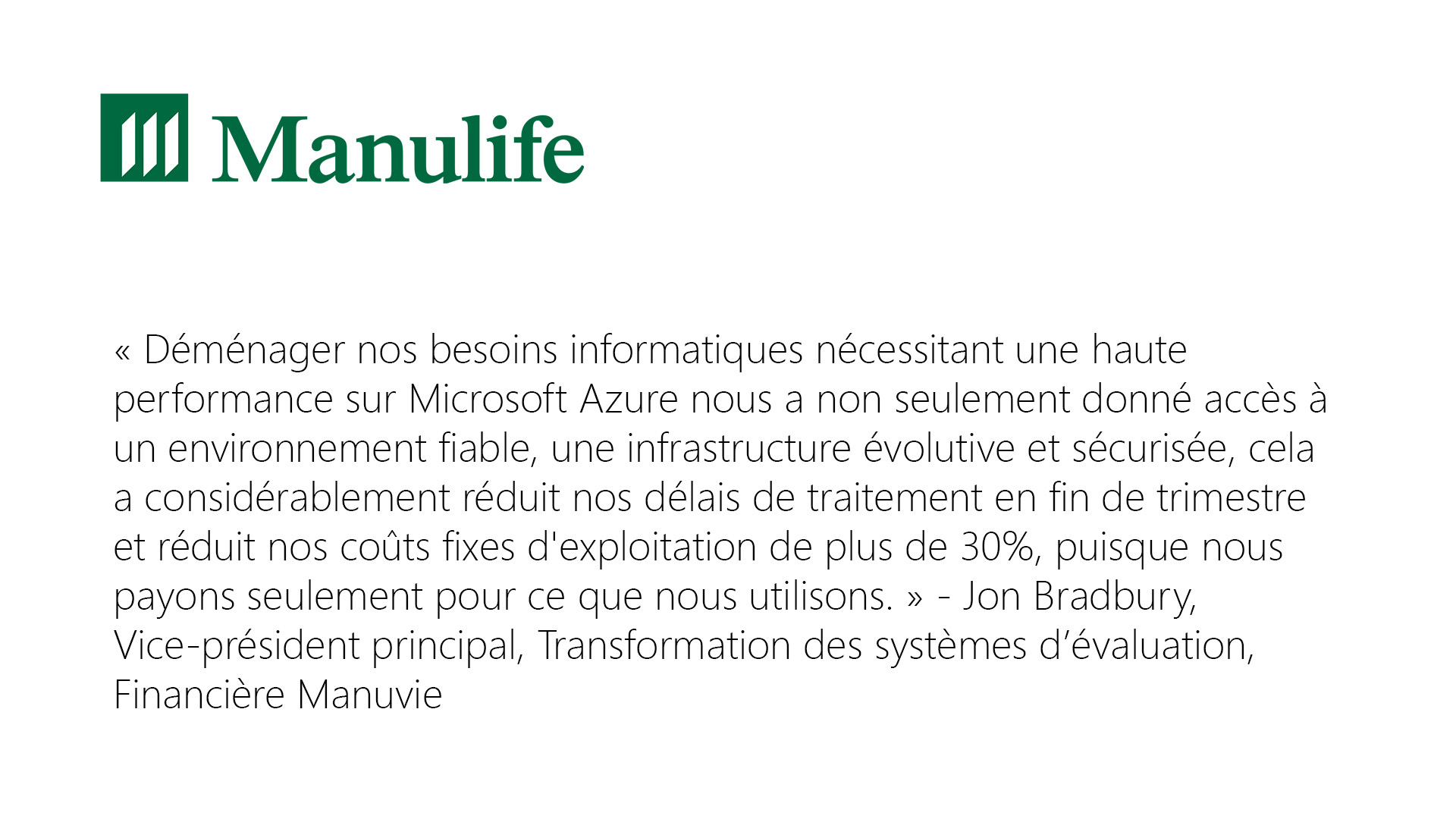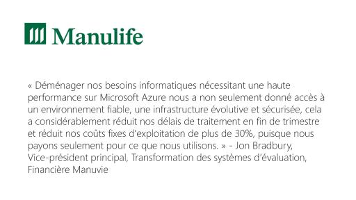 De nombreux clients et partenaires au Canada sont déjà convertis au nuage Microsoft. Parmi eux, la Financière Manuvie, une société phare de services financiers au Canada dont le mandat est de fournir des solutions avant-gardistes pour aider les clients dans leurs prises de décisions financières. Ils décrivent leur passage au nuage de Microsoft comme suit: « Déménager nos besoins informatiques nécessitant une haute performance sur Microsoft Azure nous a non seulement donné accès à un environnement fiable, une infrastructure évolutive et sécurisée, cela a considérablement réduit nos délais de traitement en fin de trimestre et réduit nos coûts fixes d'exploitation de plus de 30%, puisque nous payons seulement pour ce que nous utilisons. »