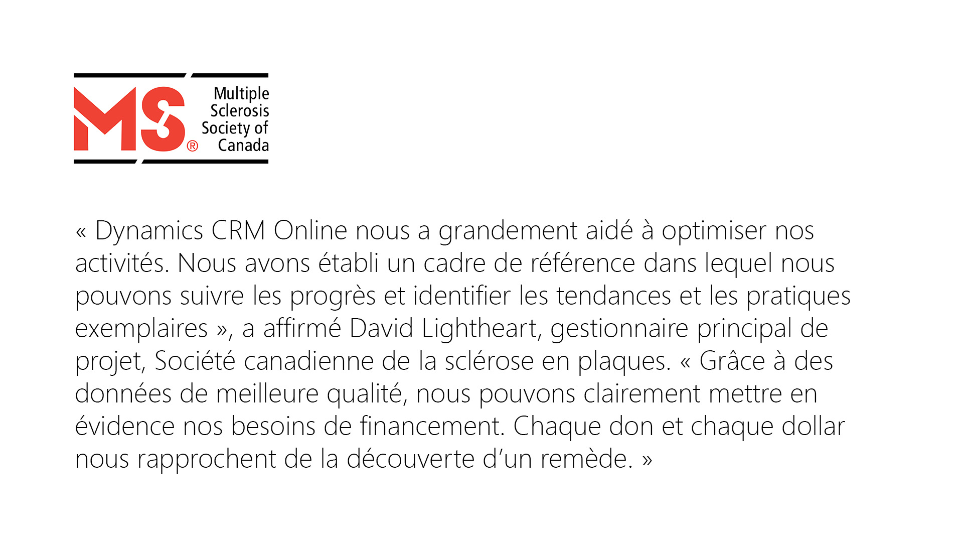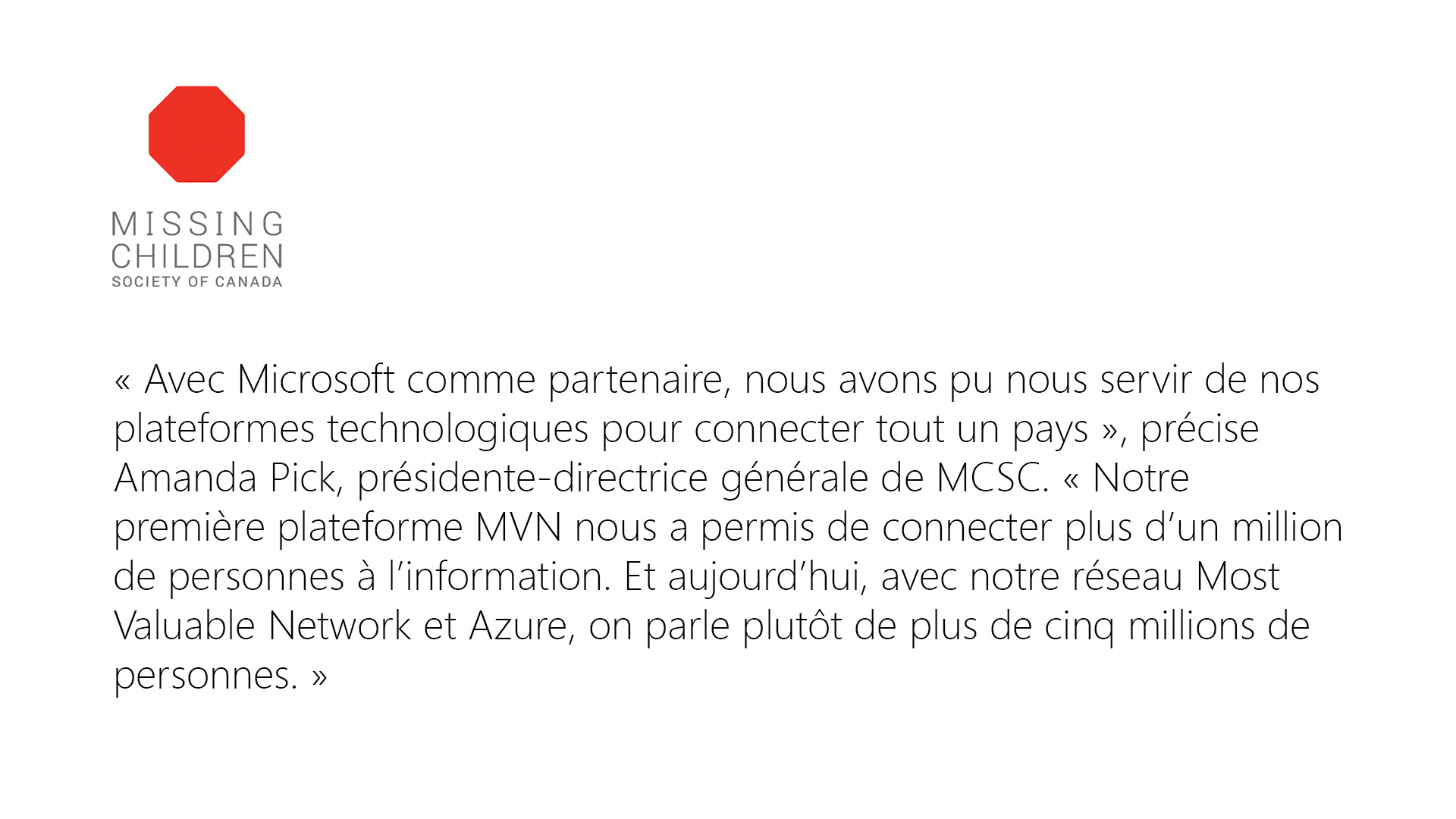 Fondée en 1985, Microsoft Canada Inc. est la filiale canadienne de Microsoft Corporation (code Nasdaq « MSFT »), le chef de file mondial du marché des logiciels, des services et des solutions qui aide les gens et les entreprises à réaliser leur plein potentiel. Microsoft Canada offre des services de vente, de marketing, de consultation et d’assistance locale partout au pays, en français et en anglais. Microsoft Canada, dont le siège social se trouve à Mississauga, possède neuf bureaux régionaux partout au pays où l’entreprise travaille à accroître les capacités des gens à l’aide de logiciels exceptionnels – en tout temps, partout et sur tout type d’appareil. Pour obtenir de plus amples renseignements au sujet de Microsoft Canada, visitez le site http://www.microsoft.com/fr-ca/default.aspx.