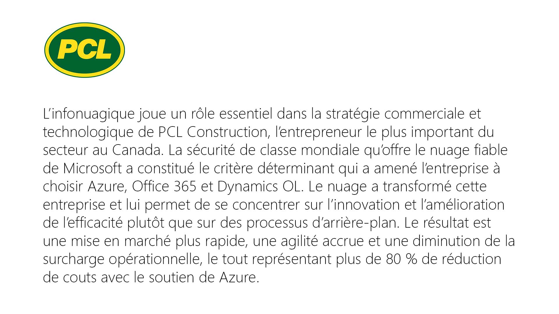 L’annonce d’aujourd’hui porte le nombre total de régions où Azure est disponible à 24 dans le monde, plus que tout autre fournisseur infonuagique, le tout soutenu par un investissement de 15 milliards de dollars (USD) dans une infrastructure des centres de données mondiale. Cela permet à des clients comme PCL Construction, la plus grande société d’entrepreneurs du Canada, d’avoir une infrastructure unifiée dans tous les pays où l’entreprise a des activités. Le nuage a transformé cette entreprise et lui permet de se concentrer sur l’innovation et l’amélioration de l’efficacité plutôt que sur des processus d’arrière-plan. Le résultat est une mise en marché plus rapide, une agilité accrue et une diminution de la surcharge opérationnelle, le tout représentant plus de 80 % de réduction de couts avec le soutien de Azure.