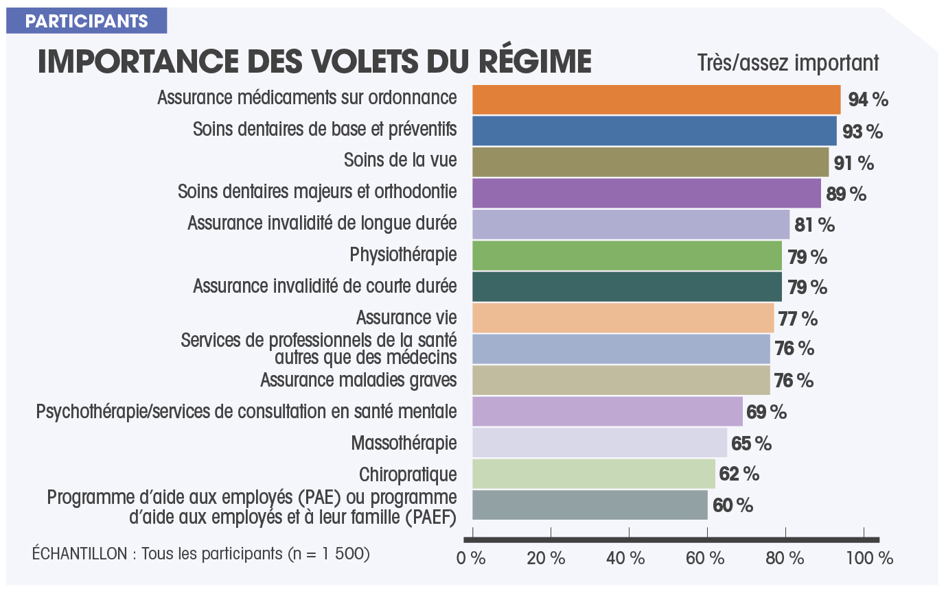 - Les membres des régimes déclarent le plus souvent que les soins de santé en matière de médicaments d’ordonnance (94 %), de soins dentaires de base (93 %) et de soins de la vue (91 %) sont très ou assez importants pour eux.