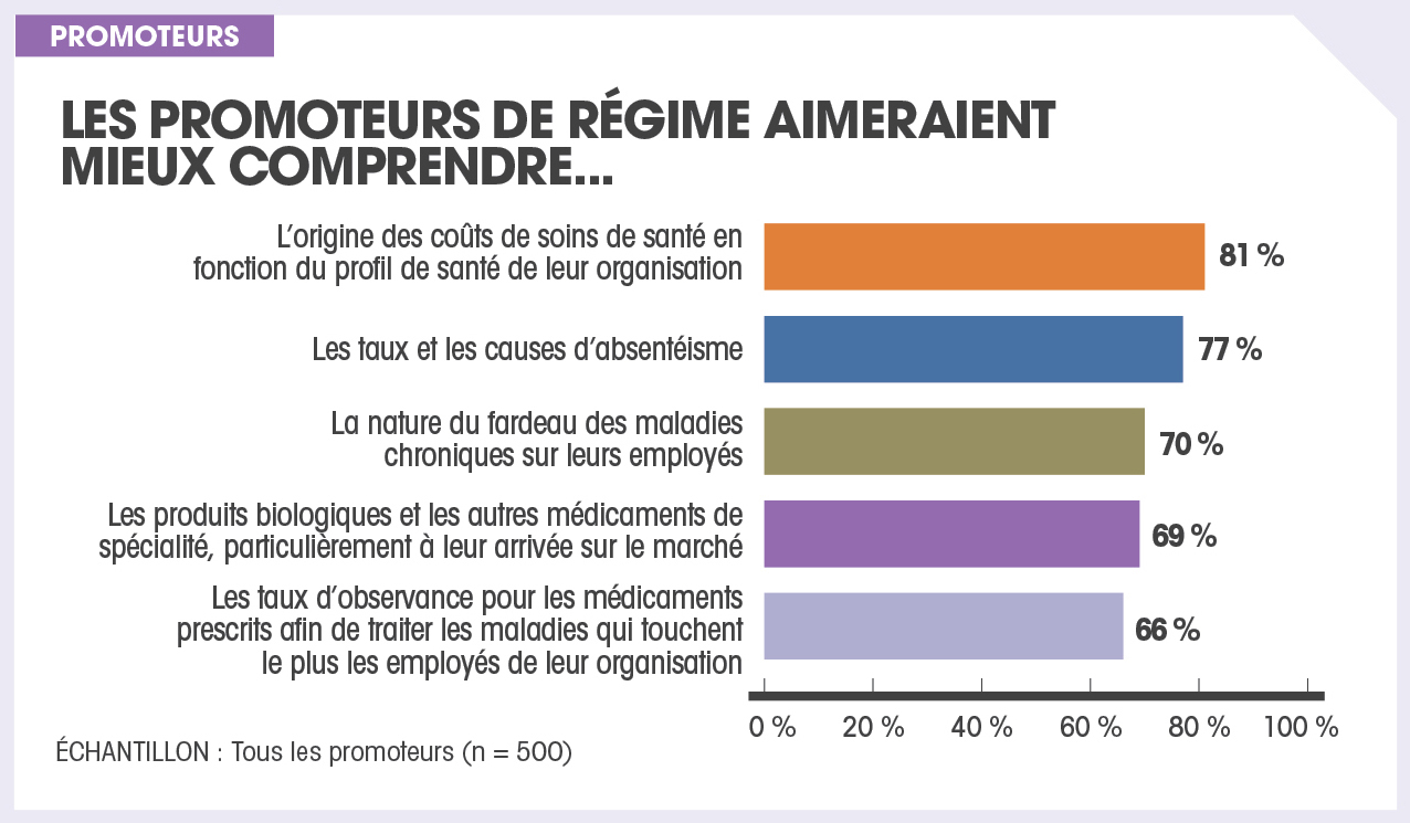 - 81 % des promoteurs de régimes souhaitent avoir une meilleure compréhension des éléments responsables des coûts des soins de santé en fonction du profil de santé de leur organisation.