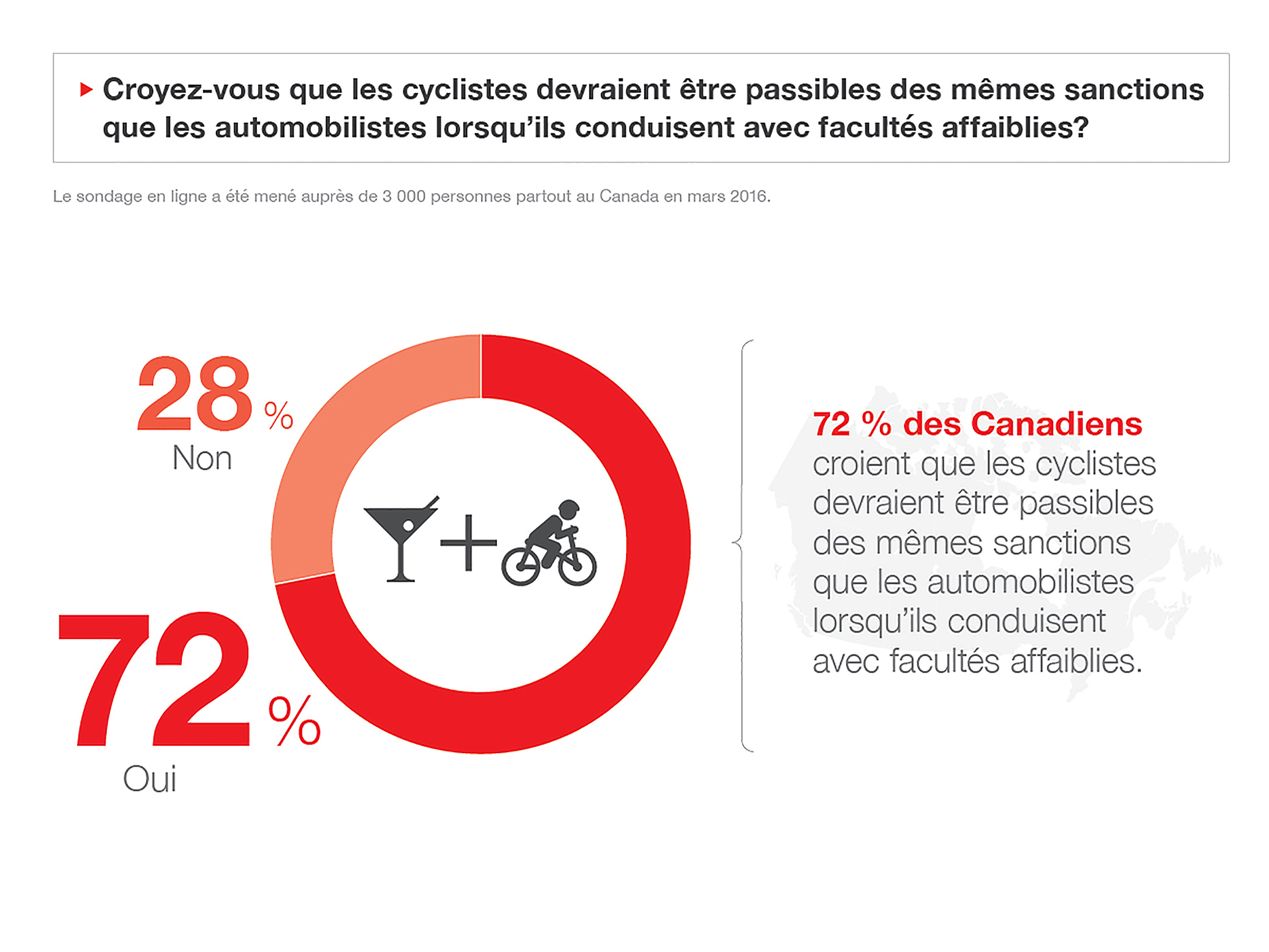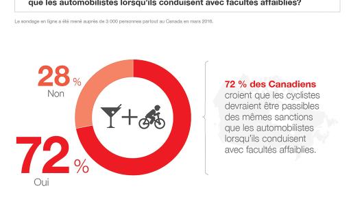Pour ce qui est de la conduite avec facultés affaiblies, plus de 72 % des répondants croient que les cyclistes devraient recevoir les mêmes sanctions que les automobilistes.