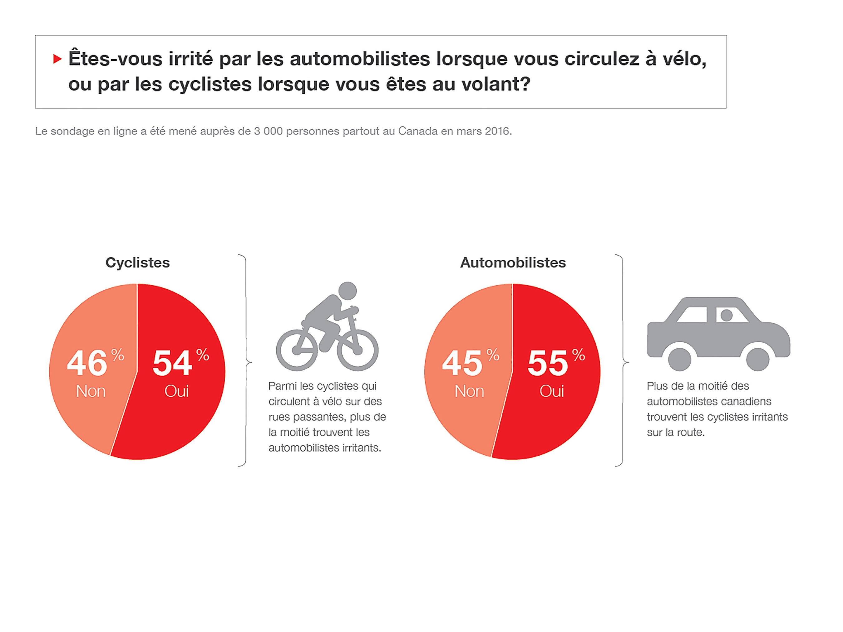 « Le conflit entre les automobilistes et les cyclistes ne date pas d’hier. L’absence d’infrastructures à l’usage des adeptes du vélo et la confusion quant aux règles encadrant le partage de la route expliquent en bonne partie ce conflit, affirme John Bordignon, porte-parole de State Farm. Des choses qui semblent insignifiantes aux yeux des conducteurs, comme des bouches d’égout et des nids-de-poule, sont très dangereuses pour les cyclistes. Par contre, si ces derniers ne respectent pas le code de la route ou prennent toute une voie à eux seuls, ils risquent de recevoir quelques coups de klaxon. Mieux comprendre les lois locales, rester concentré et surtout sobre, au volant comme au guidon, est essentiel pour notre sécurité à tous.»