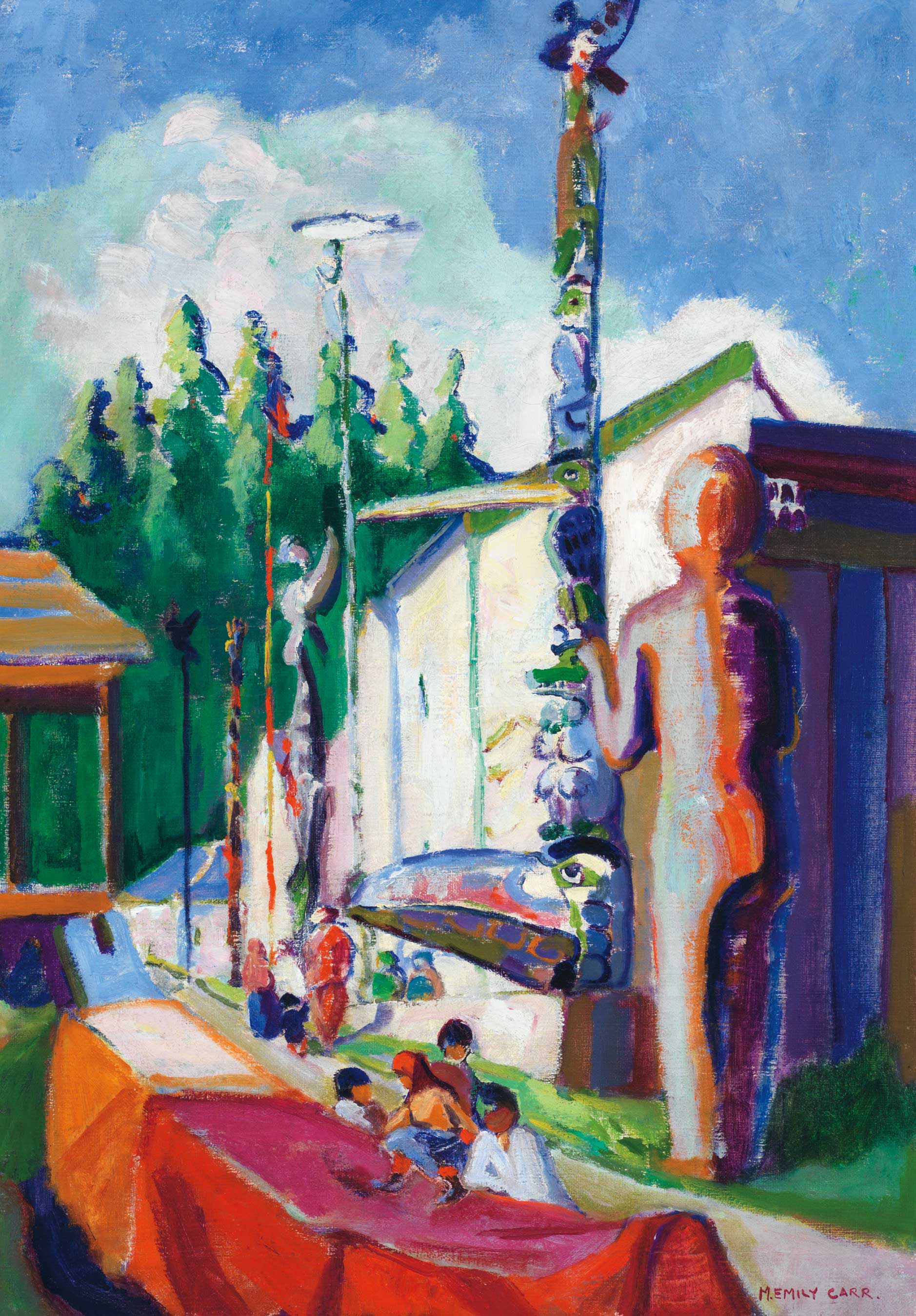 - Un ensemble d’importants tableaux d’Emily Carr, avec à sa tête Alert Bay (with Welcome Figure) et ses couleurs vibrantes, résultat des études de l’artiste à Paris, sera également présenté aux enchères (il est estimé entre 900 000 $ et 1 200 000 $). Est aussi inclus dans la vente Arbutus Trees, un tableau précédemment acquis par l’éminent physicien Robert Christy, qui participa au projet Manhattan (son évaluation varie de 150 000 $ à 250 000 $).