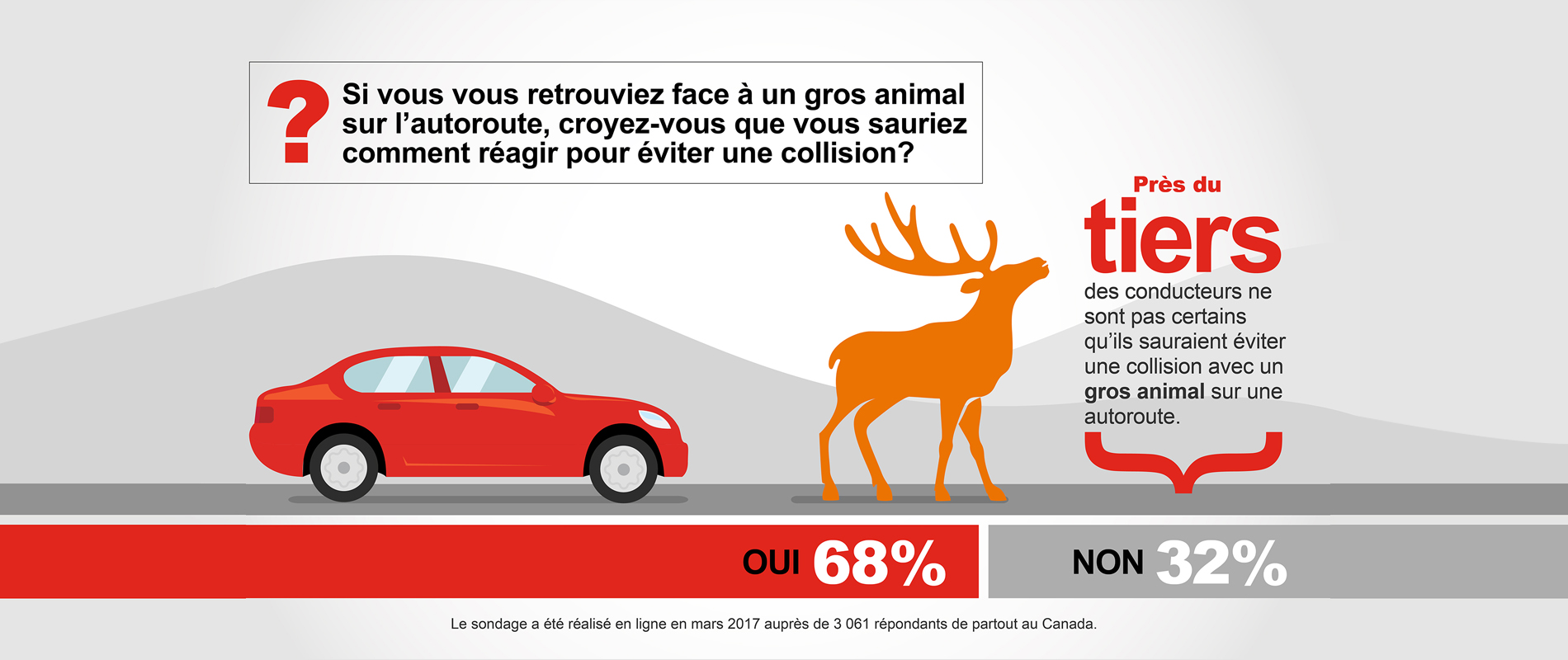 Environ un conducteur sur trois n’est pas certain qu’il saurait éviter un gros animal, et plus de 80 % croient qu’une meilleure éducation du public est nécessaire pour prévenir des collisions pouvant entraîner des blessures et des décès.