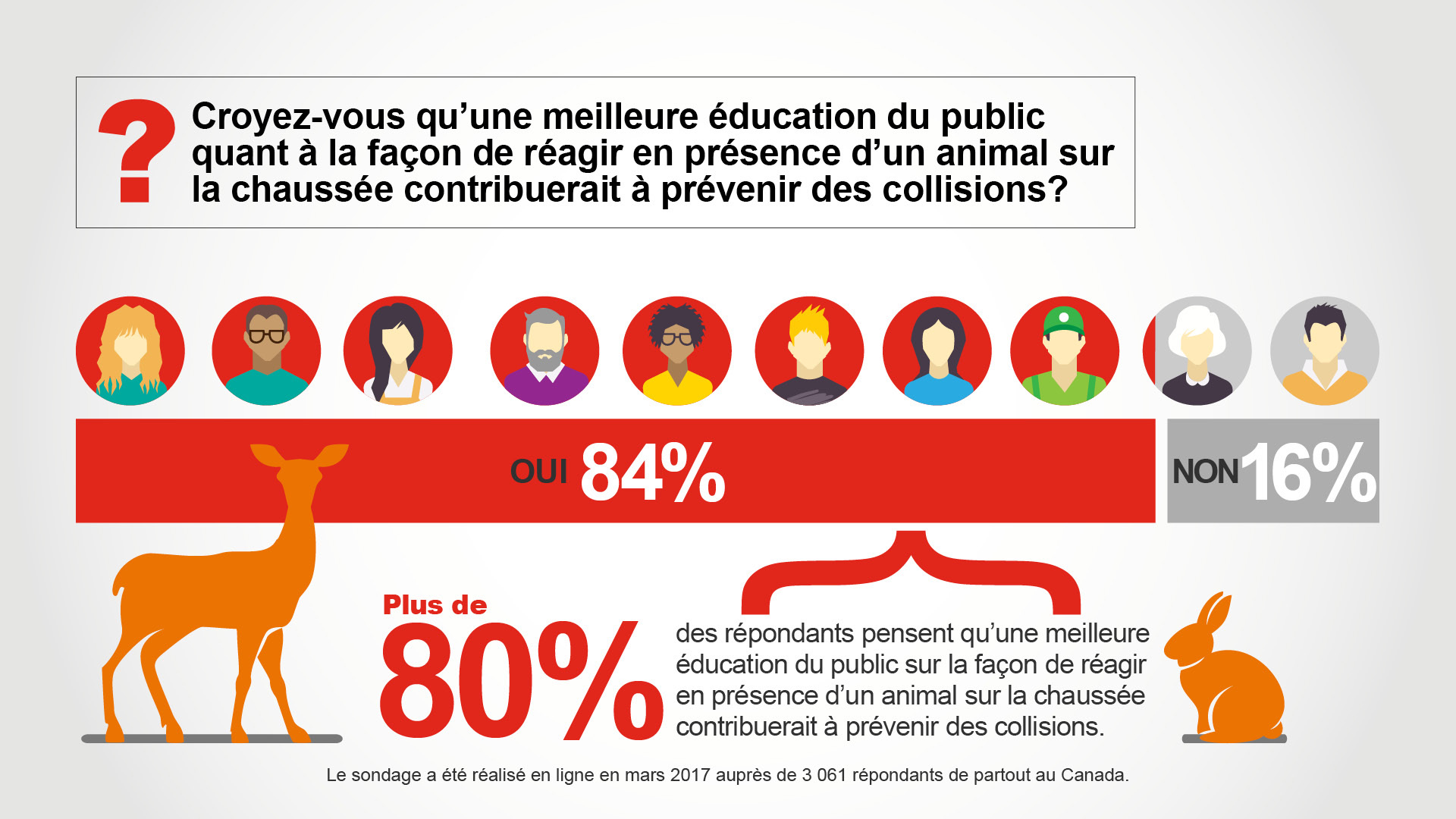 Environ un conducteur sur trois n’est pas certain qu’il saurait éviter un gros animal, et plus de 80 % croient qu’une meilleure éducation du public est nécessaire pour prévenir des collisions pouvant entraîner des blessures et des décès.