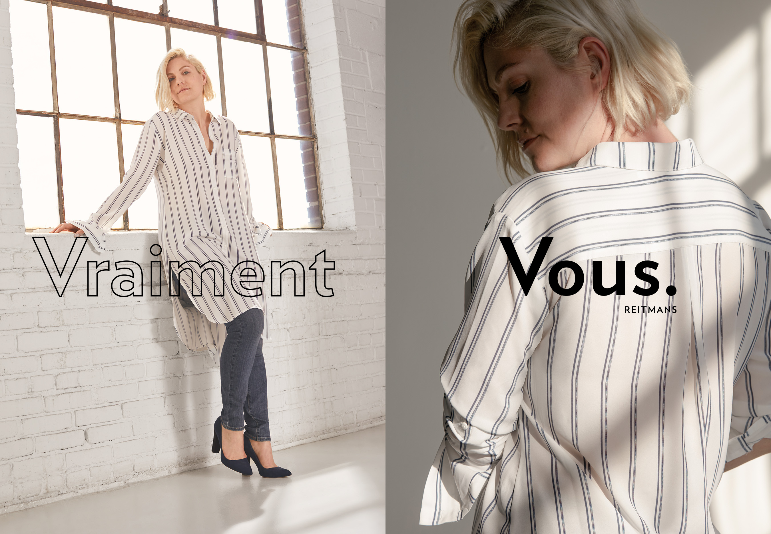 En savoir plus« Vraiment Vous. Reitmans dénote l’évolution que connaît la marque depuis quelques années. Les vastes études de marché que nous avons réalisées nous ont appris que pour bien des femmes, la confiance en soi rime avec l’authenticité. Les femmes ne choisissent pas leurs vêtements pour épater la galerie, mais plutôt pour exprimer leur individualité. En partant de ce principe, nous avons élaboré une plateforme de marque ayant pour objectif de véhiculer un message crédible qui va à la rencontre des besoins des clientes et remplit ses promesses. Cette ode aux femmes les incite à s’habiller à leur image et leur rappelle que la confiance en soi est toujours à la mode. Donnons la possibilité aux femmes d’être elles-mêmes, parce qu’elles sont belles telles qu’elles sont », explique Valérie Vedrines, vice-présidente marketing de Reitmans.