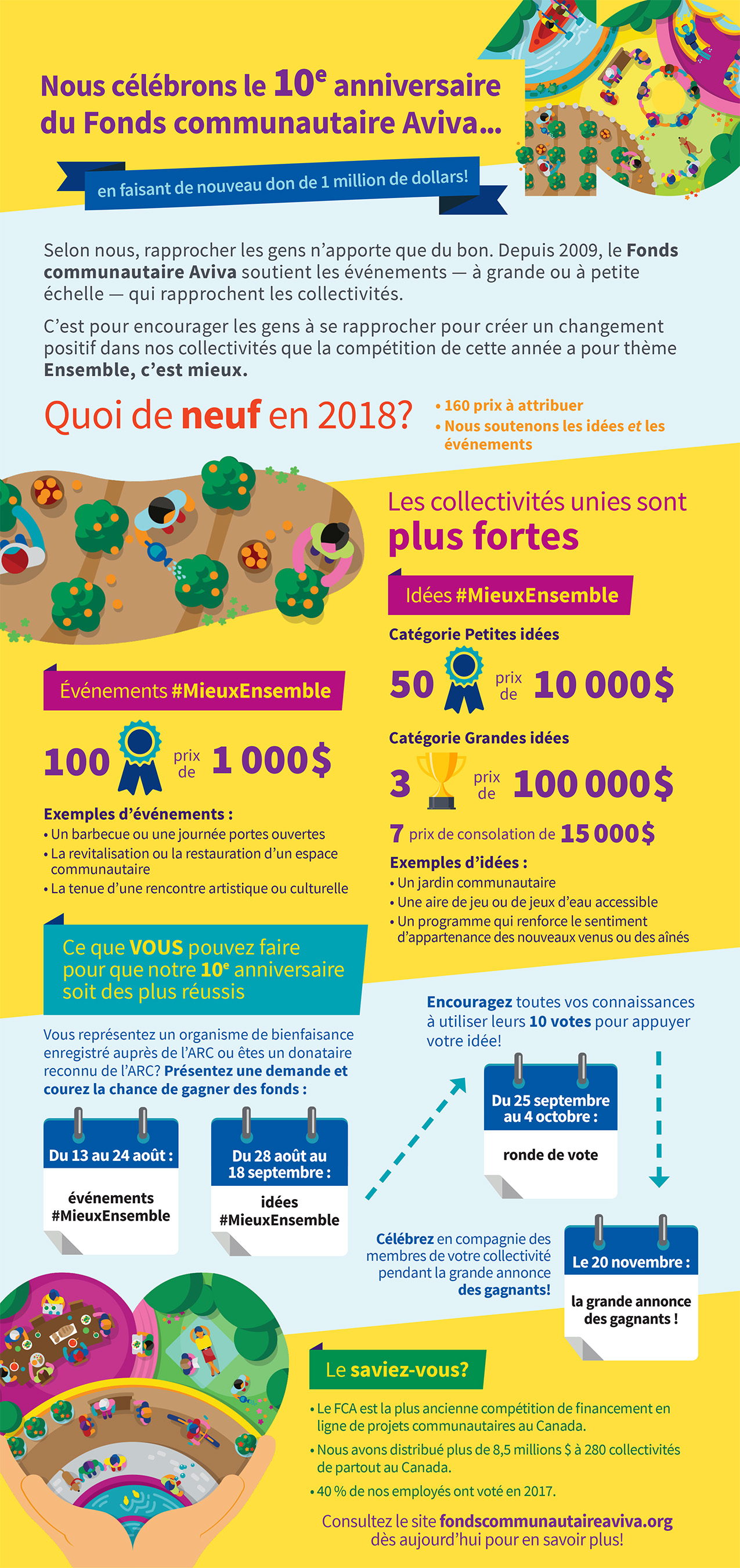 20 novembre 2018 (Toronto, Ontario) – Le Fonds communautaire Aviva dévoile aujourd’hui les gagnants des catégories Petites idées et Grandes idées de l’édition 2018 de sa compétition. Depuis 2009, Aviva Canada a financé, à hauteur de plus de 9,5 millions de dollars, des projets locaux et plus de 400 groupes communautaires et organisations caritatives des quatre coins du pays.