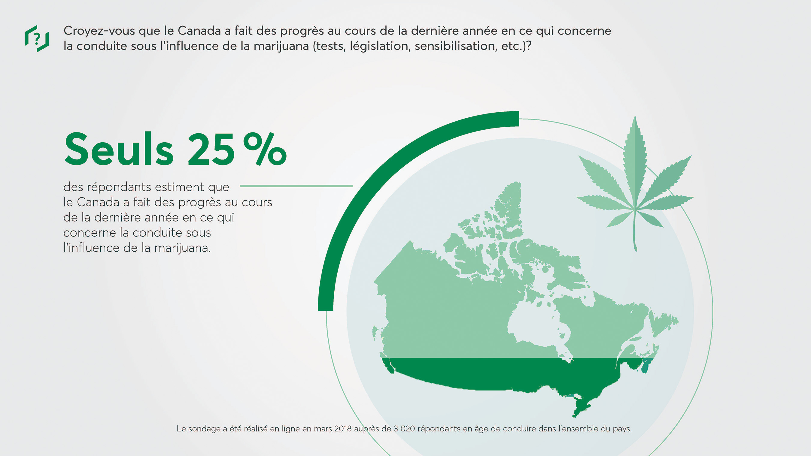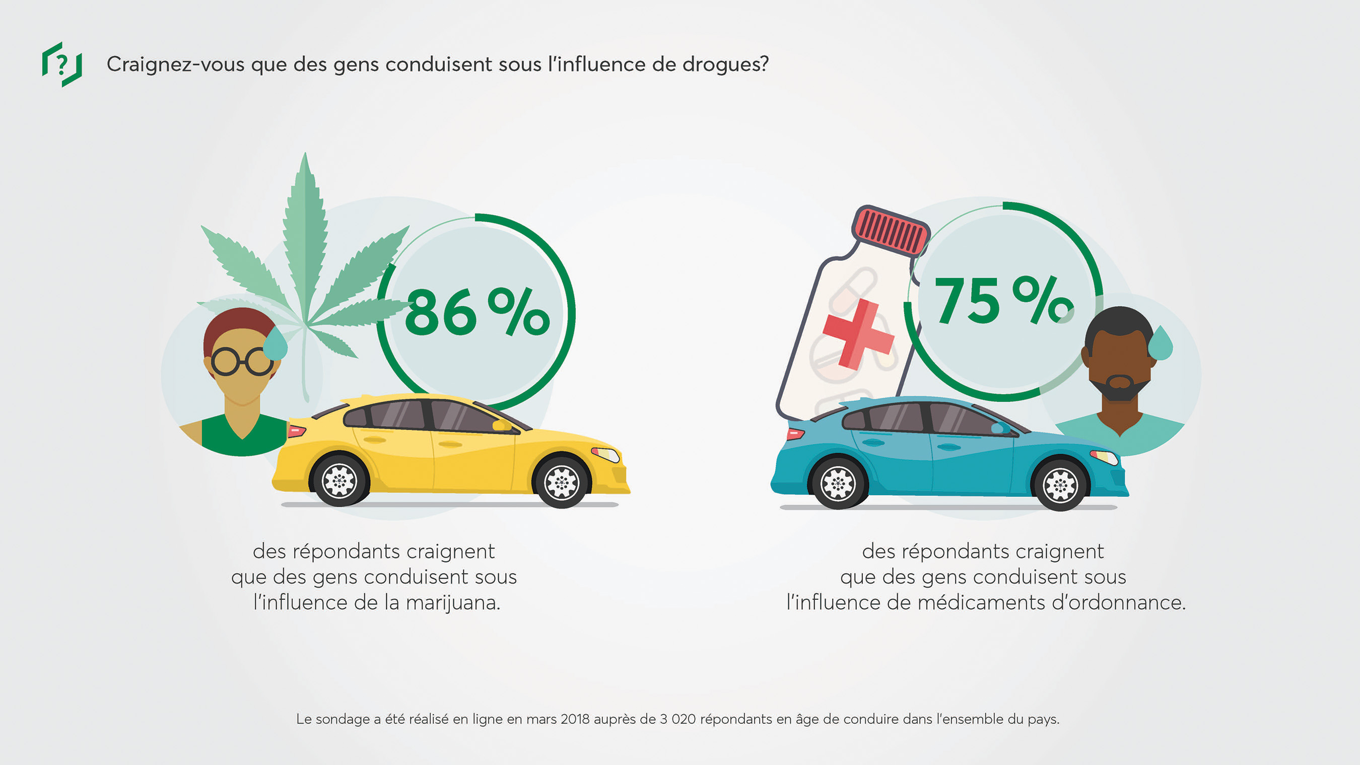 La plupart des répondants (71 %) croient que la conduite avec facultés affaiblies augmentera avec la légalisation du cannabis. Un pourcentage encore plus élevé (77 %) s’inquiète du fait que les conducteurs ne sont pas encore suffisamment sensibilisés à ce sujet. Un nouveau rapport de la Fondation de recherche sur les blessures de la route au Canada mentionne que le pourcentage de conducteurs décédés dans un accident de la route chez qui on a trouvé des traces de marijuana est passé de 15,9 % en 2000 à 20,9 % en 2015.